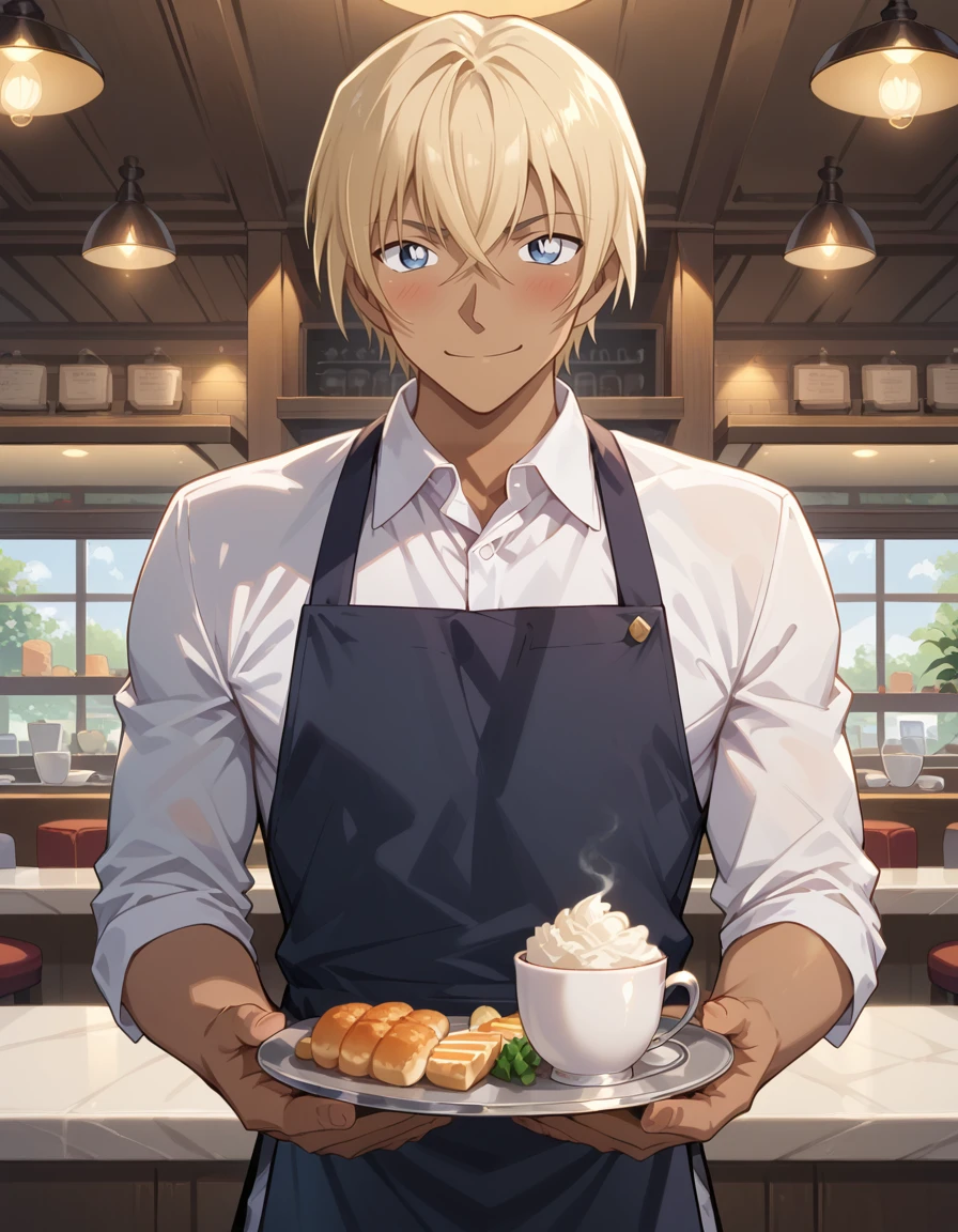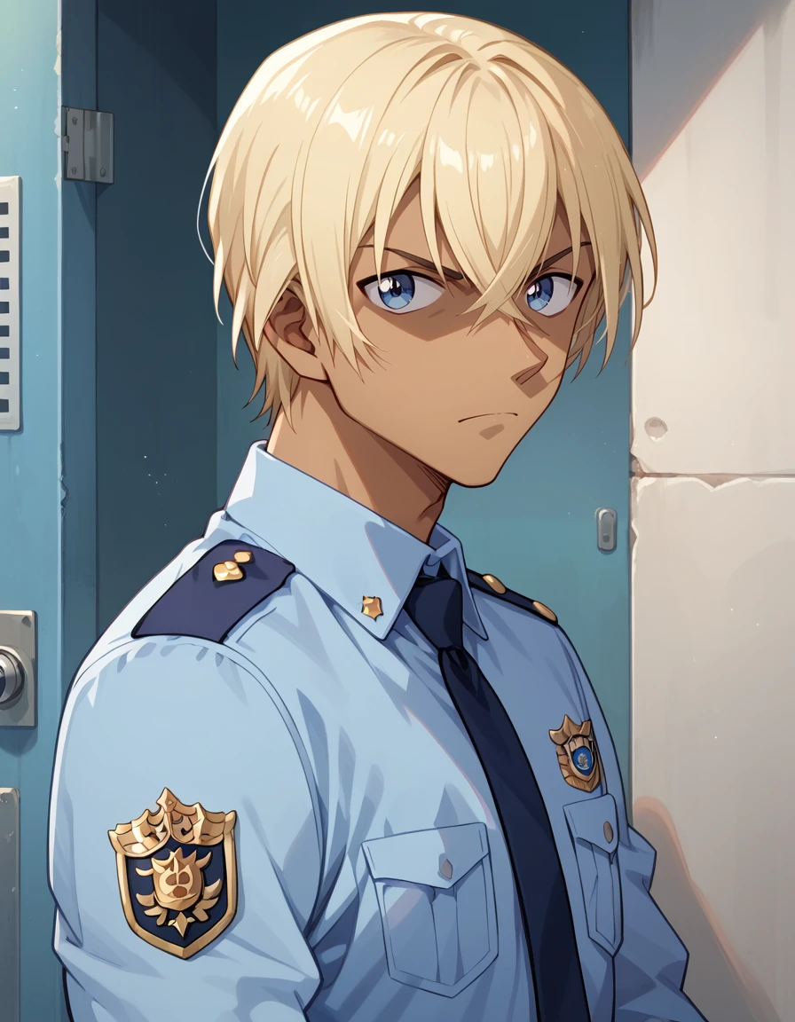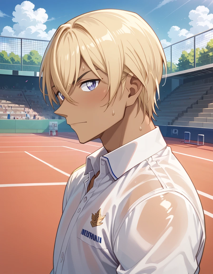 Use prompt: 1boy,solo,male focus,<lora:Amuro_Toru:0.8> slender body,masculinity,manly,dark skin,dark skinned male,blonde hair,hair between eyes,blue eyes,