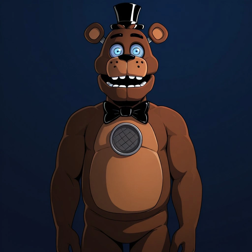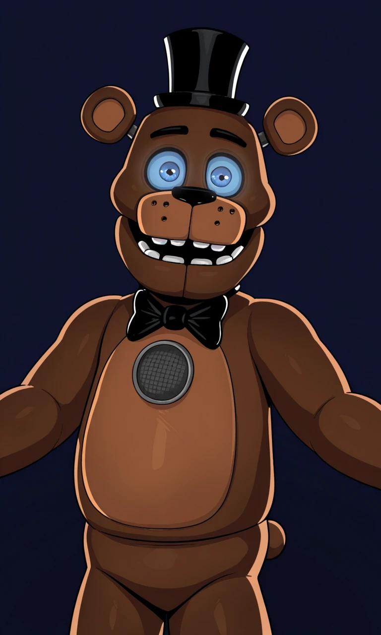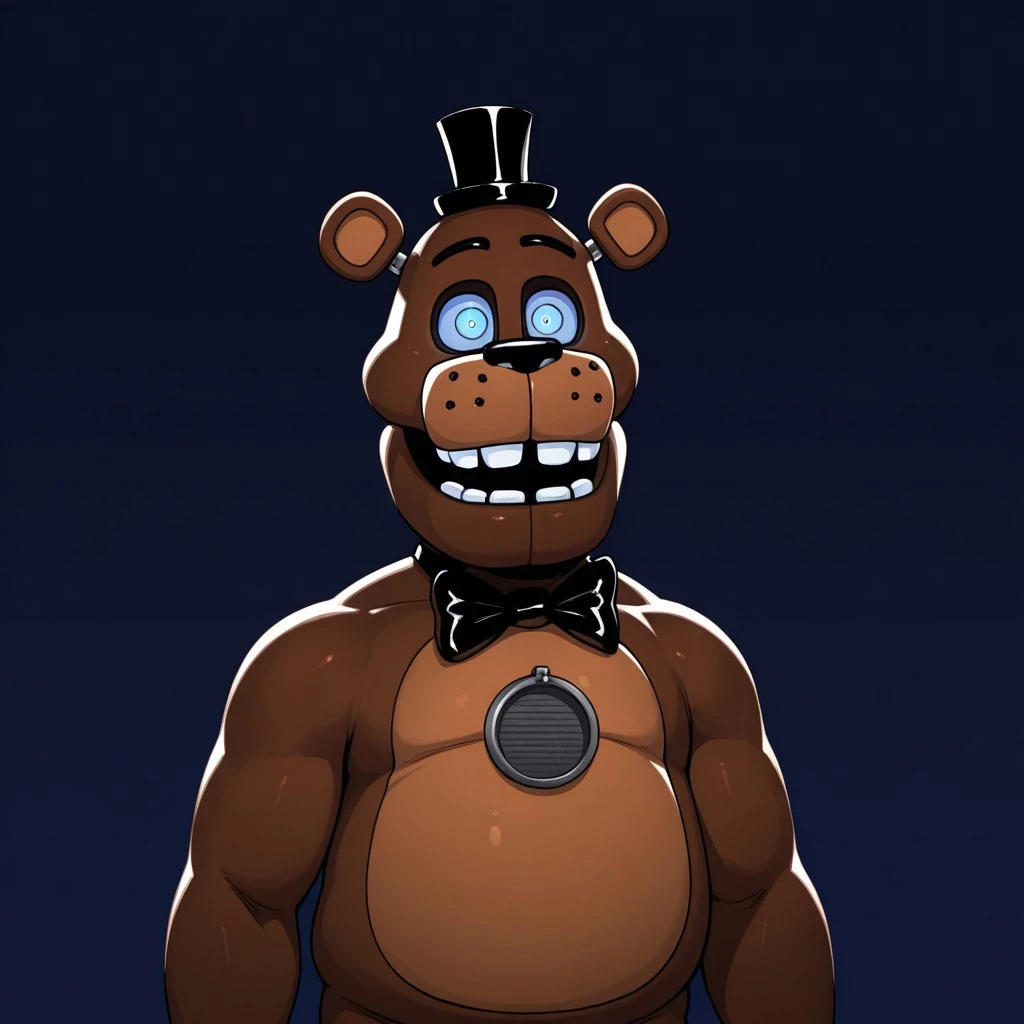 LonelyFreddyFnaF,animatronic, anthro, furry,bear,male,solo,black fur,Light brown muzzle, light Brown belly,Chest speaker,black top hat,black Bowtie,bright blue sclera,Bright blue eyes,Black eyebrows
