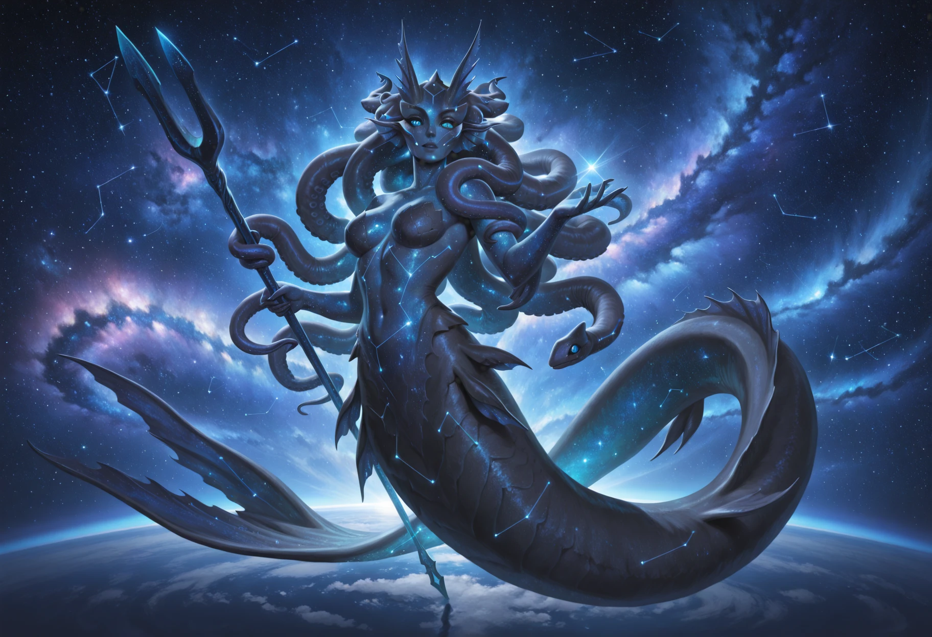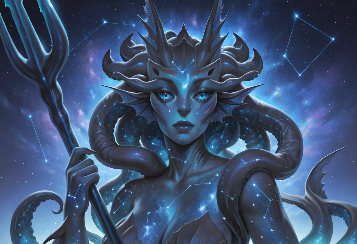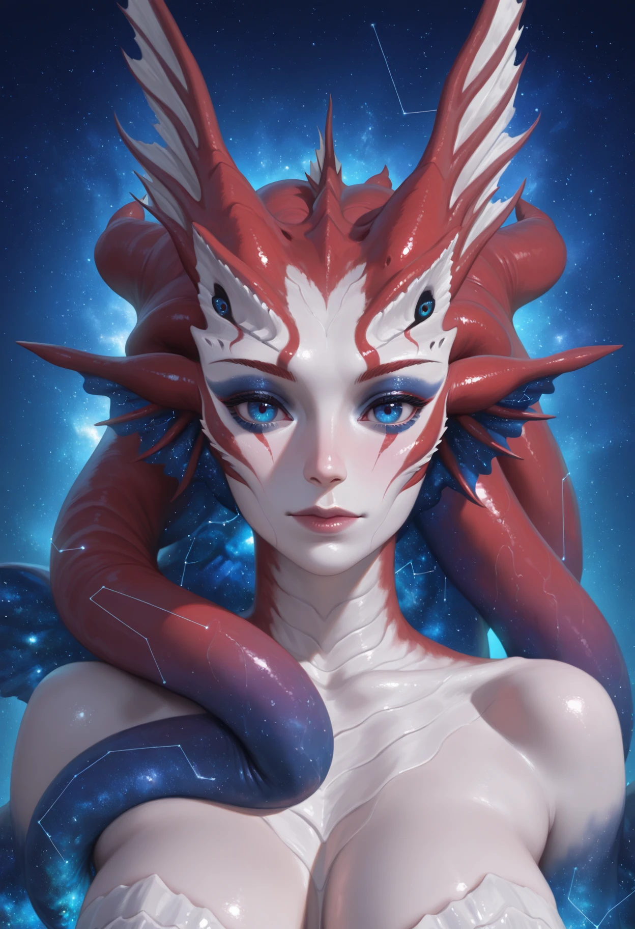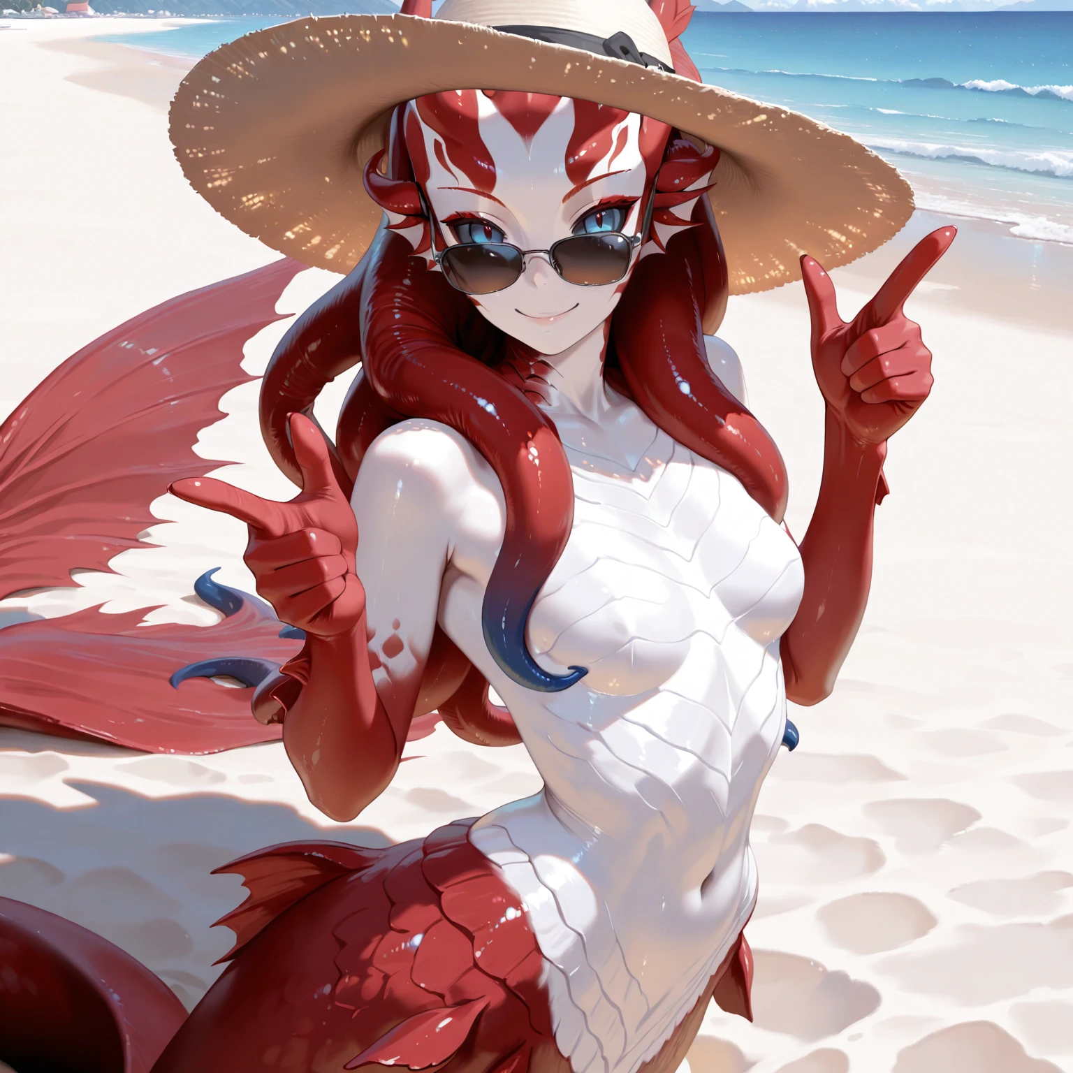 Tags: mermaid, monster girl, fish scales, pale skin, red arms, blue eyes, red tentacle hair, two-tone skin, tail, red fins, nebula skin effect (optional)
