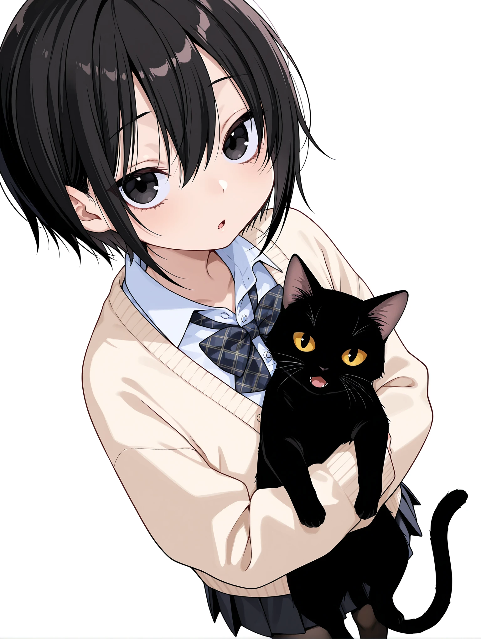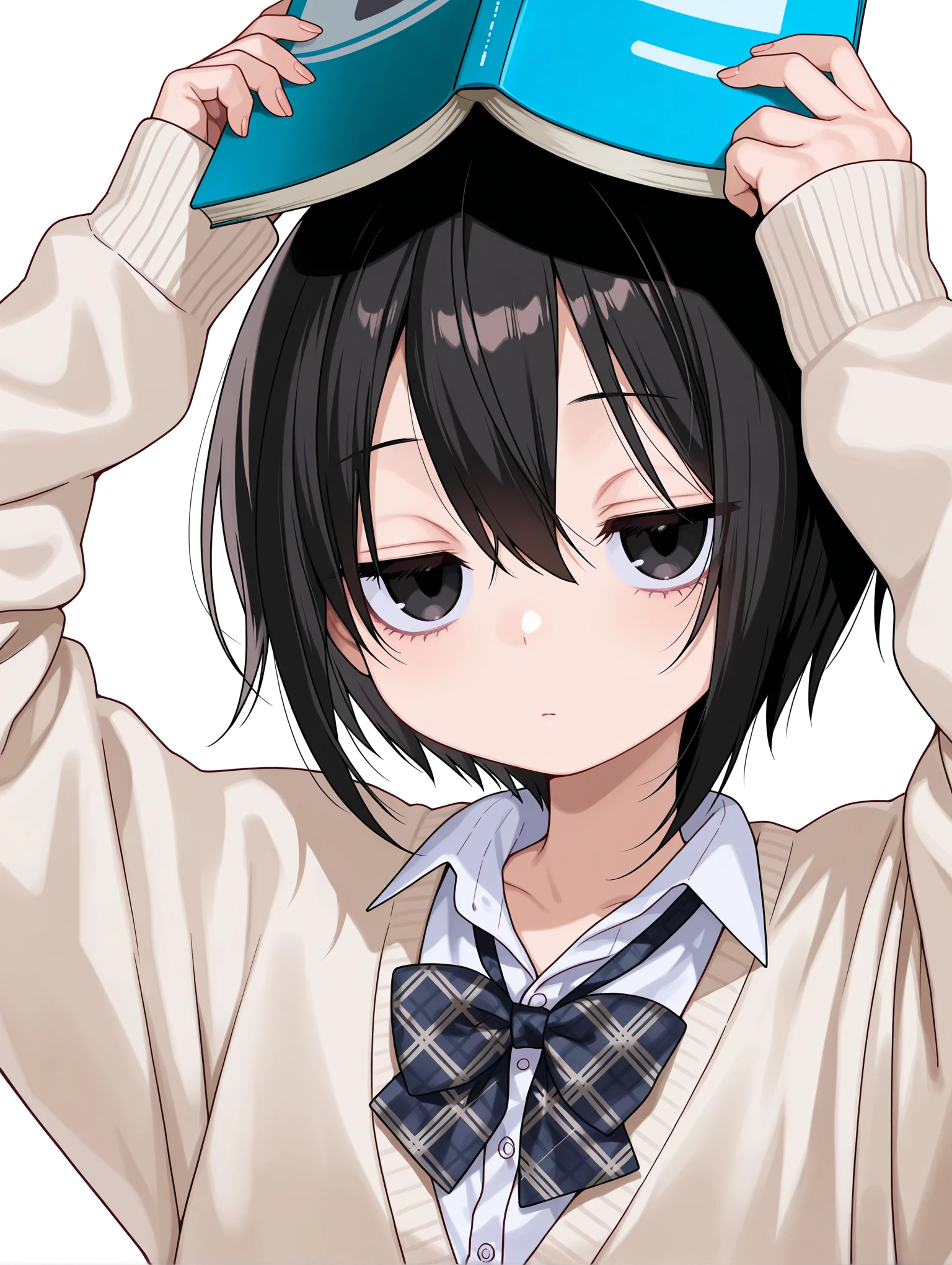 c_clothes,plaid bowtie,white shirt,cardigan,sleeves past wrists,black_pantyhose,black_loafers,