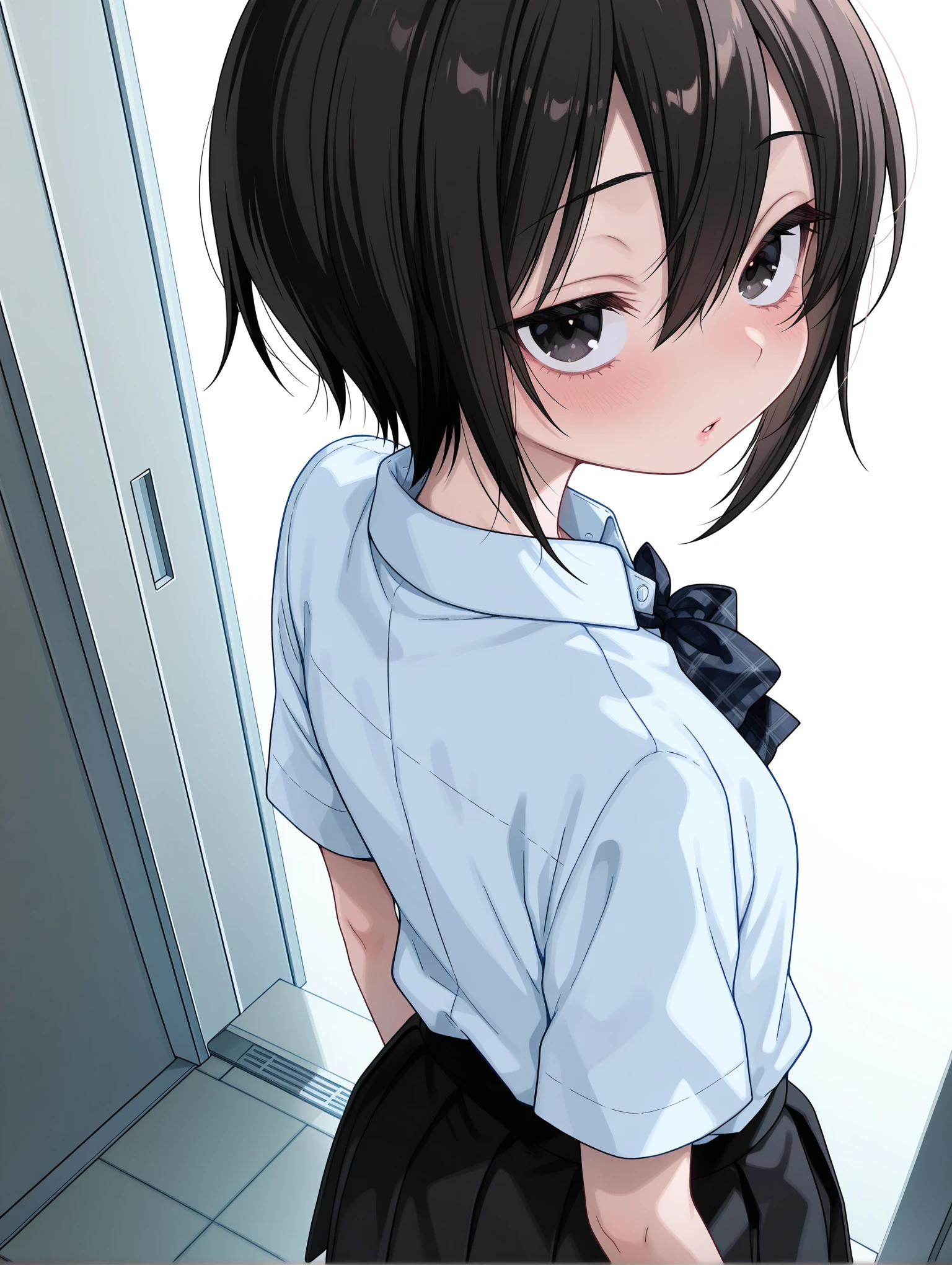 s_clothes,short_sleeves,collared shirt,plaid bowtie,black_pantyhose,black_loafers,