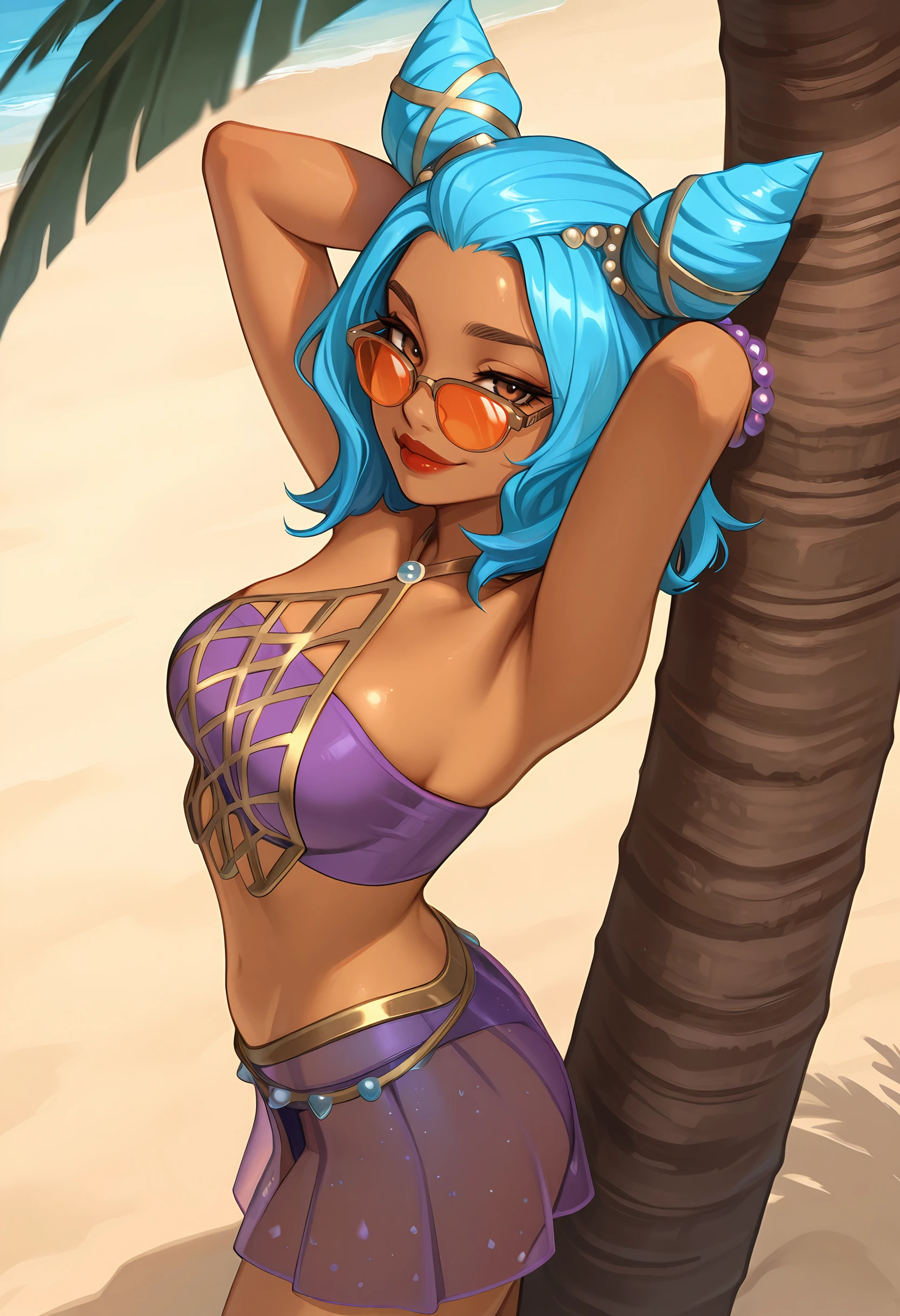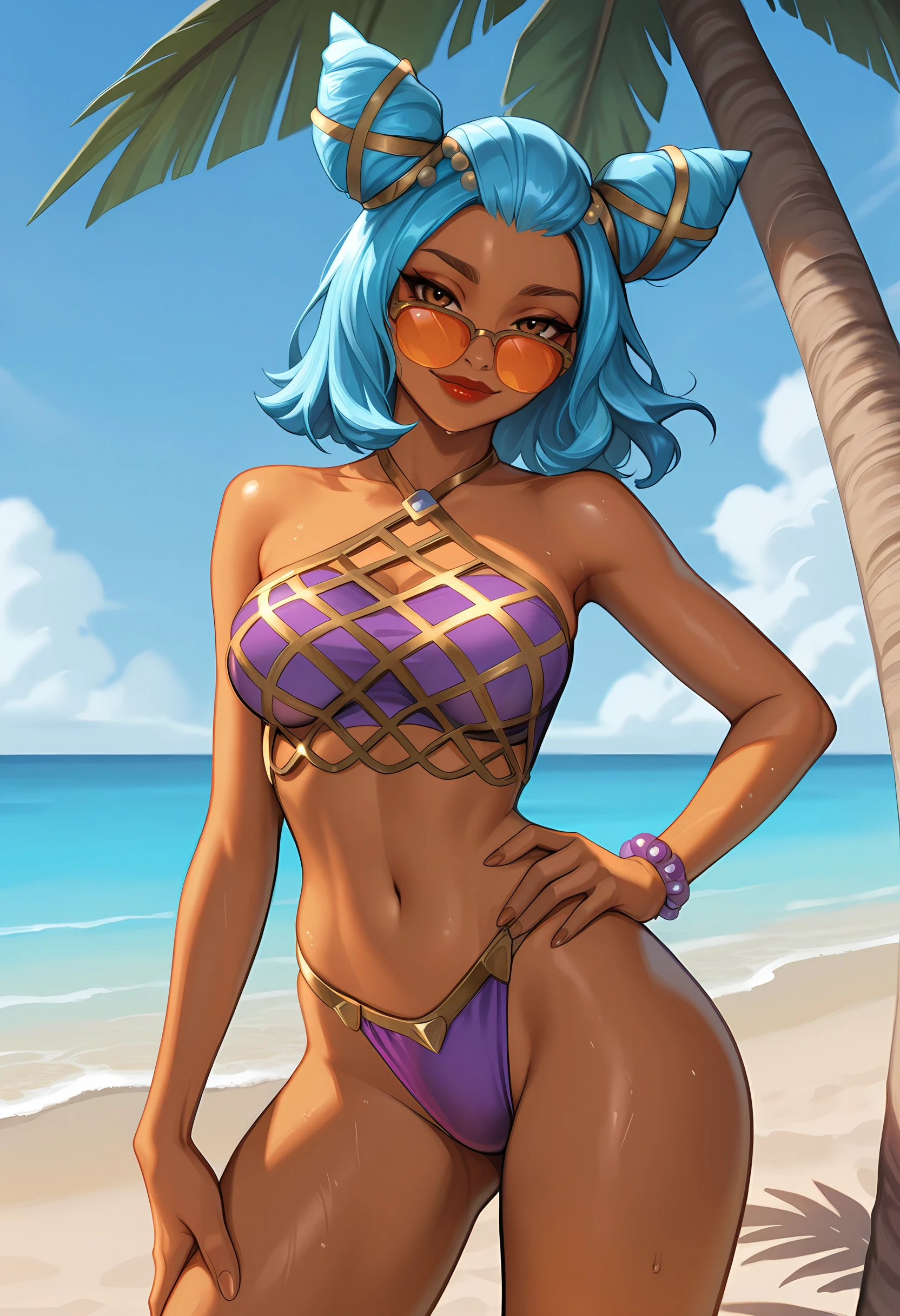 oszeriil, medium breasts, brown eyes, blue hair, cone hair bun, double bun, medium hair, dark-skinned female, orange-tinted eyewear, looking over eyewear, purple bikini, bandeau, beads, bead bracelet, see-through skirt, bare shoulders, midriff, strapless, red lips,