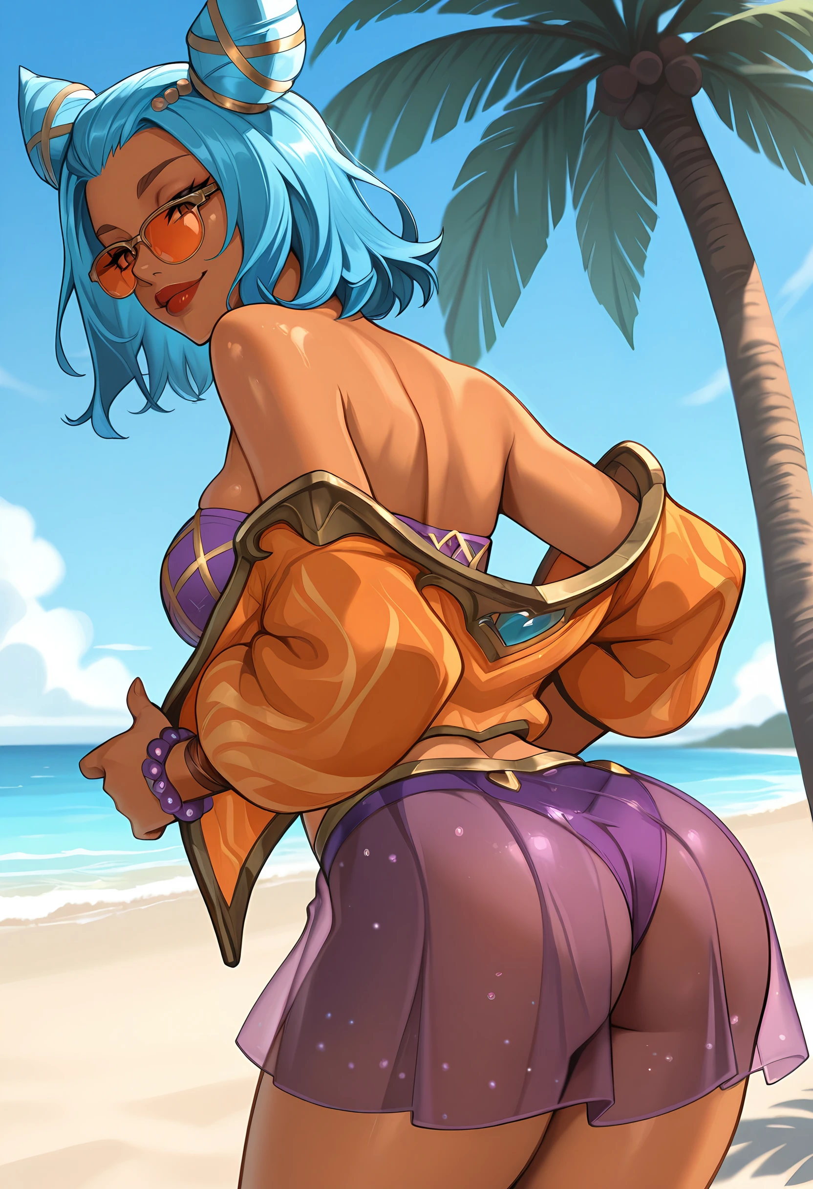 oszeriil, medium breasts, brown eyes, blue hair, cone hair bun, double bun, medium hair, dark-skinned female, orange-tinted eyewear, looking over eyewear, purple bikini, bandeau, beads, bead bracelet, see-through skirt, bare shoulders, midriff, strapless, red lips, open jacket, orange jacket,I use V12 WAI-NSFW-illustrious-SDXL checkpoint for my images.