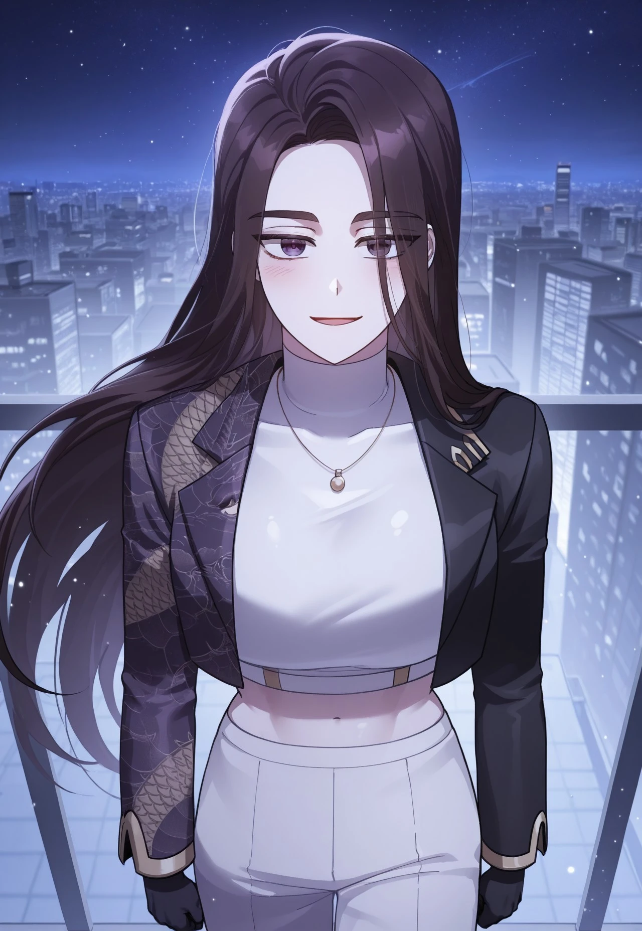 Yi_Byul, dark purple eyes, dark brown hair, long hair, Byul-Daily-Clothes, white turtleneck, midriff, dragon jacket, gloves, white pants, necklace
