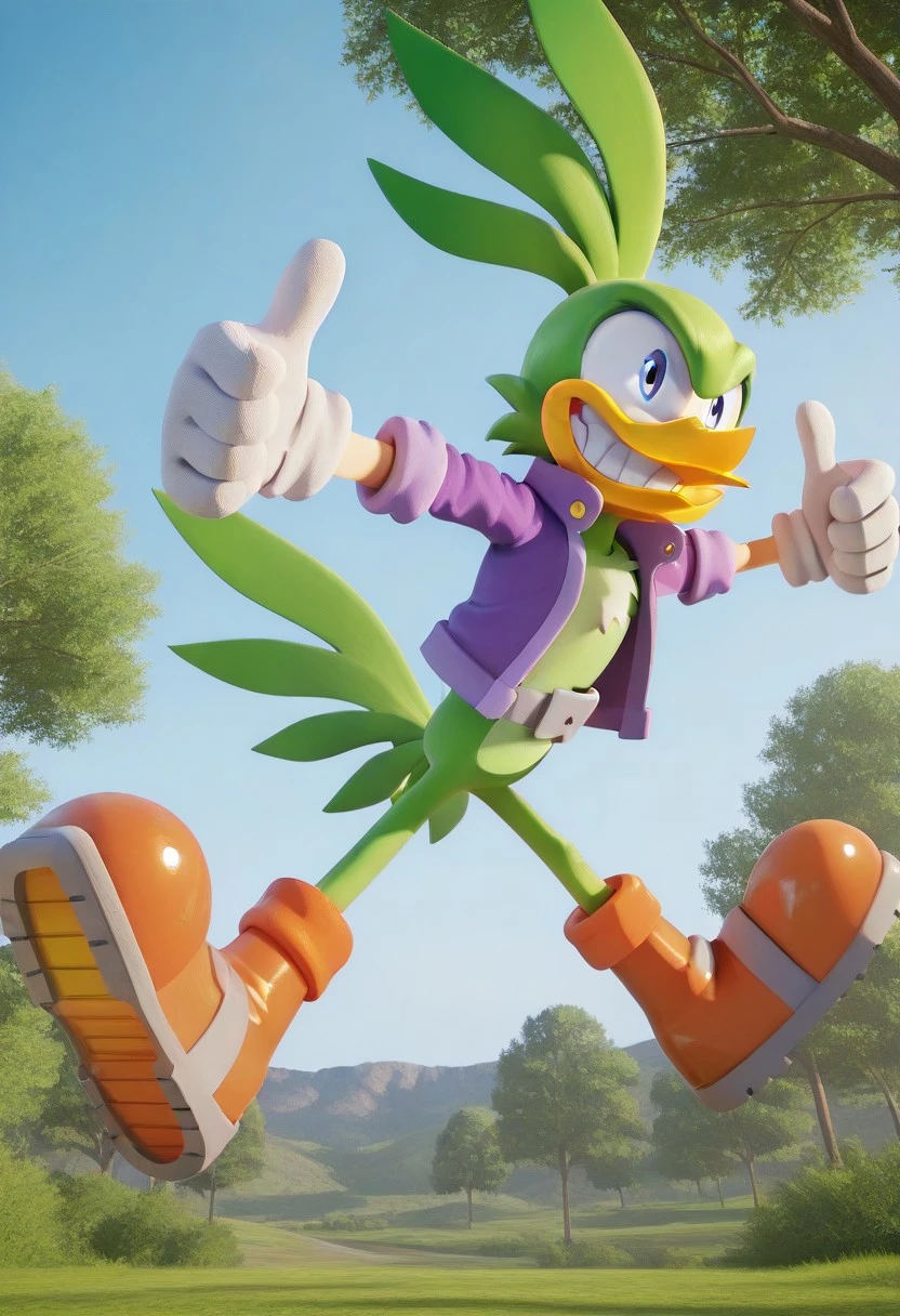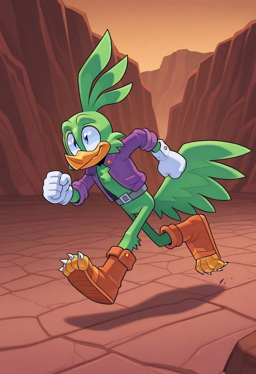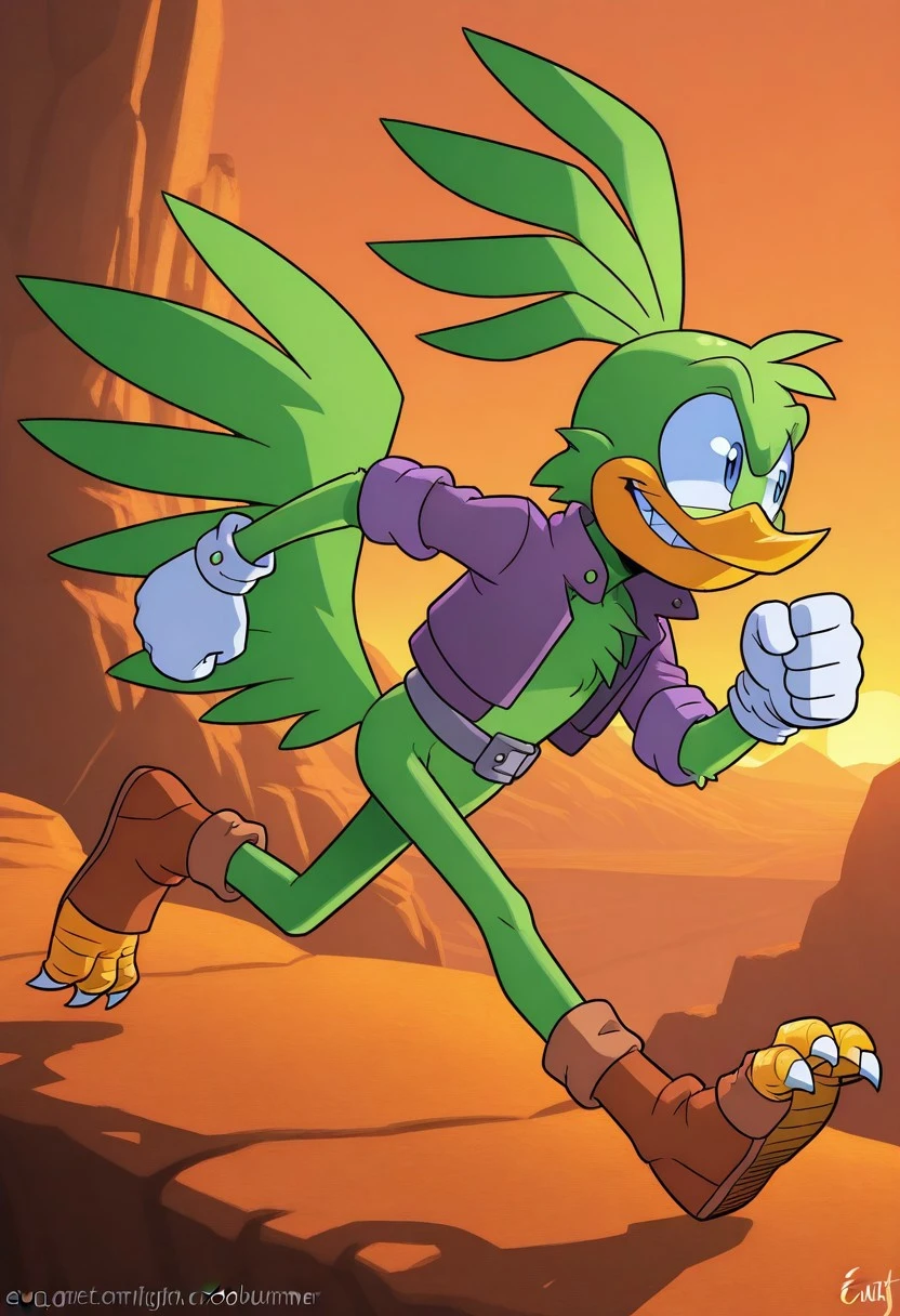 Jolt the Roadrunner, green fur, yellow beak, blue eyes, green tail feathers, purple coat, gray belt, white gloves, orange and brown shoes with talons