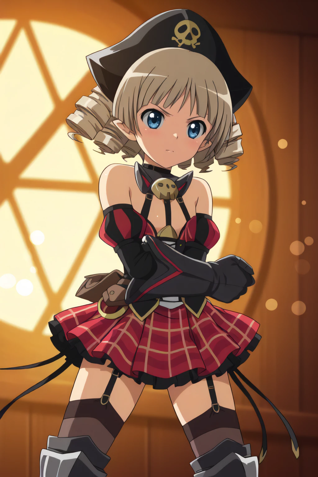 armor, armored dress, detached sleeves, garter straps, pirate hat, plaid, short hair, skirt, thighhighs