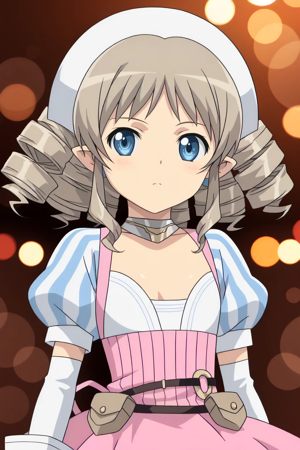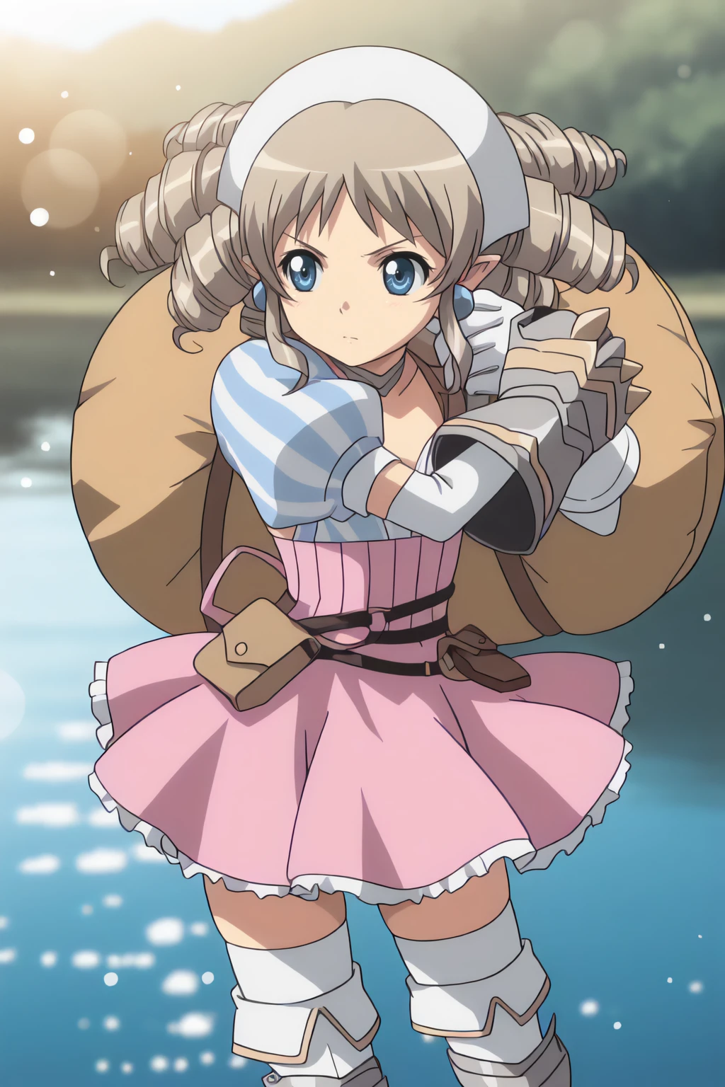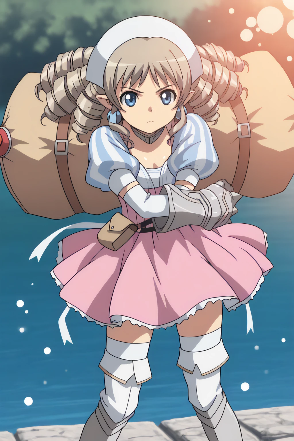 thighhighs, drill hair, pointy ears, skirt, gauntlets, armor, garter straps, black gothic dress, plaid skirt, plaid, short hair,