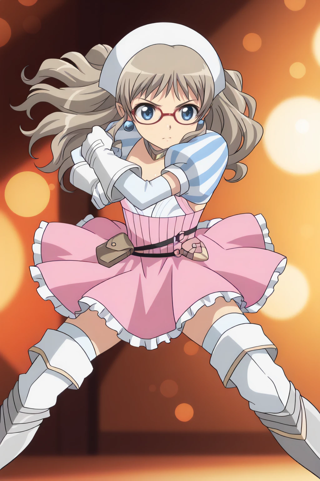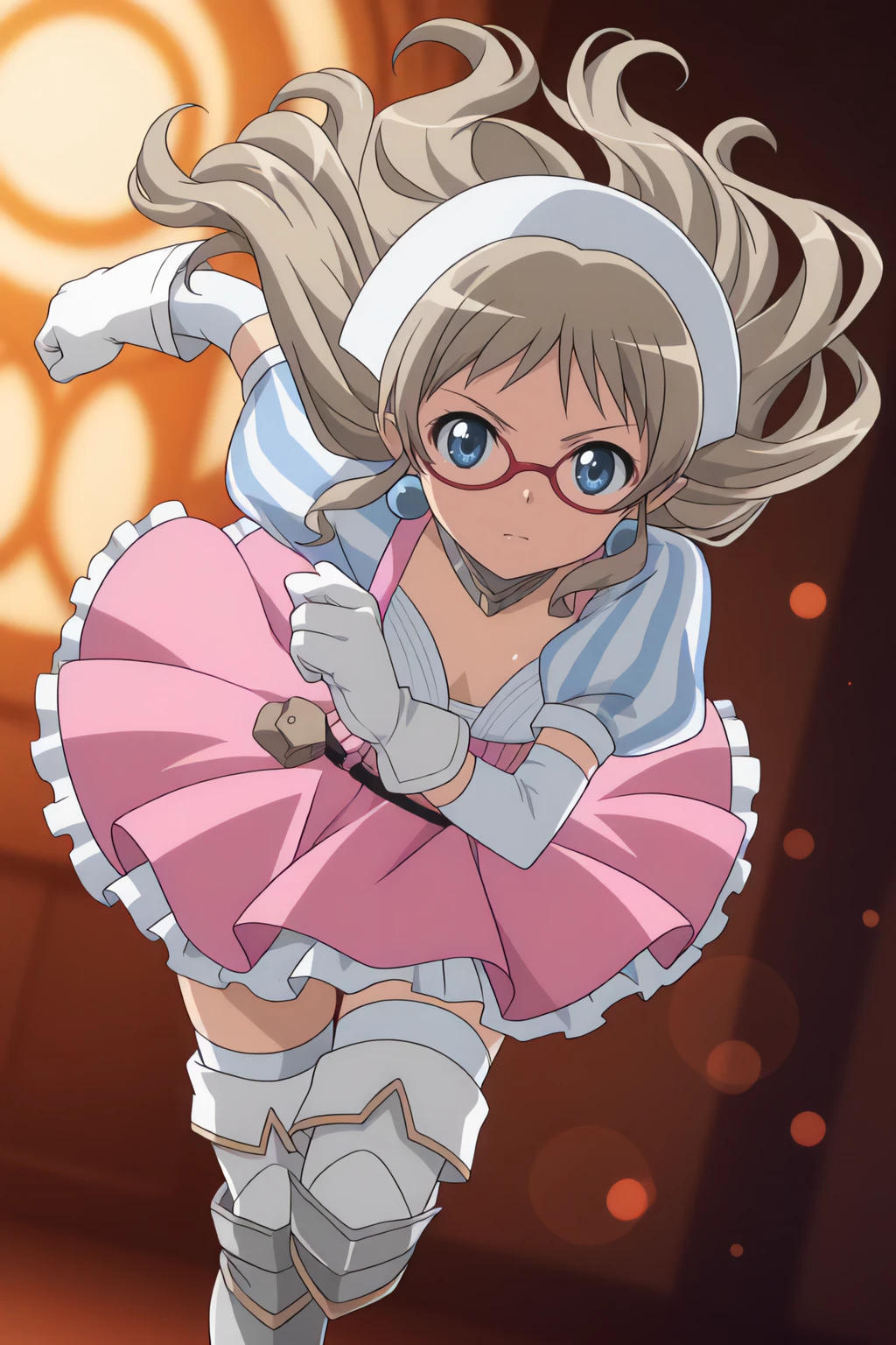 armor, armored dress, earrings, glasses, gloves, hairband, jewelry, long hair, red-framed eyewear, thighhighs