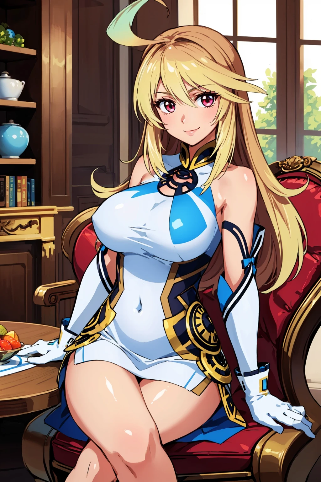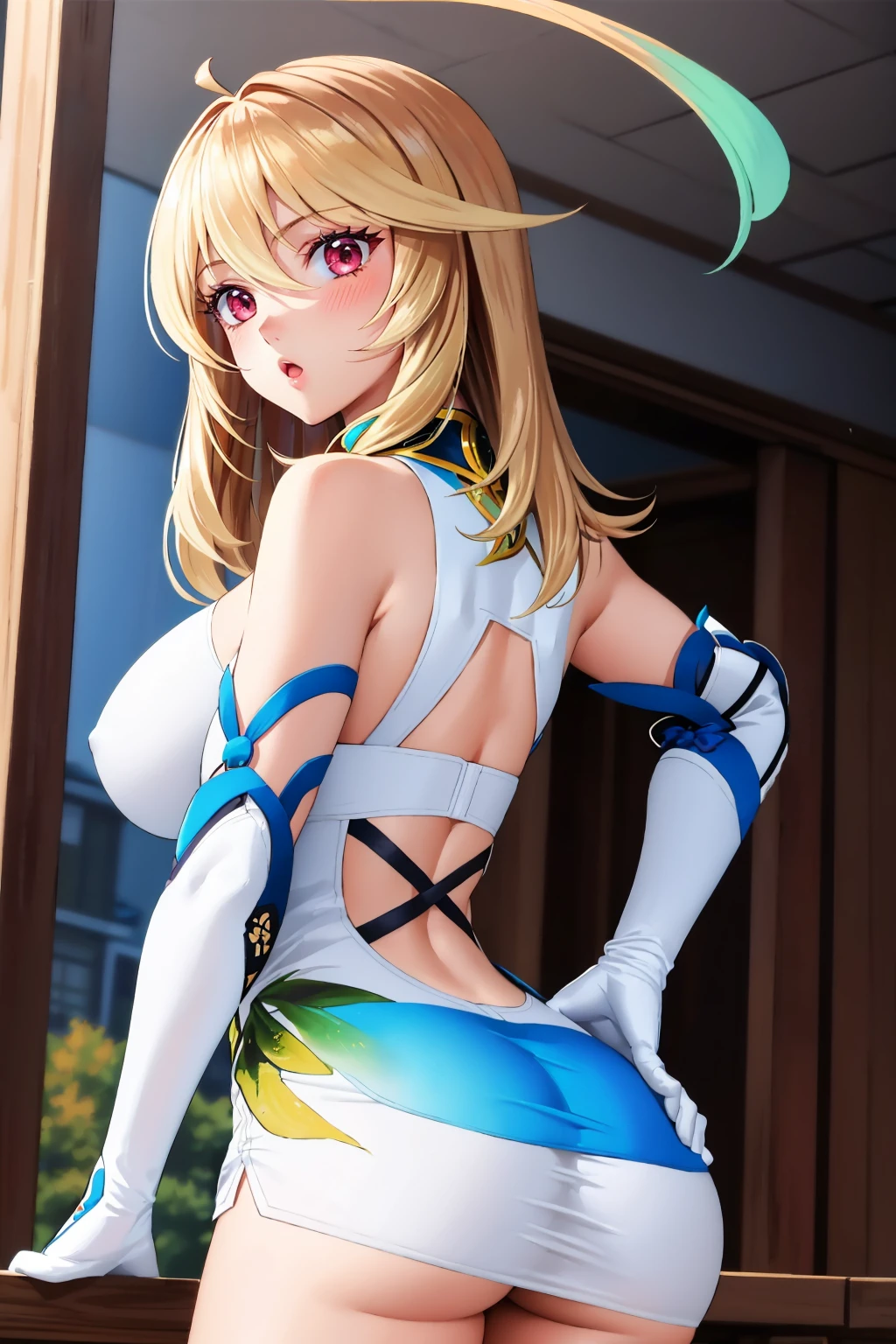 tox2milla, multicolored hair, ahoge, white and blue dress, short dress, elbow gloves, white gloves