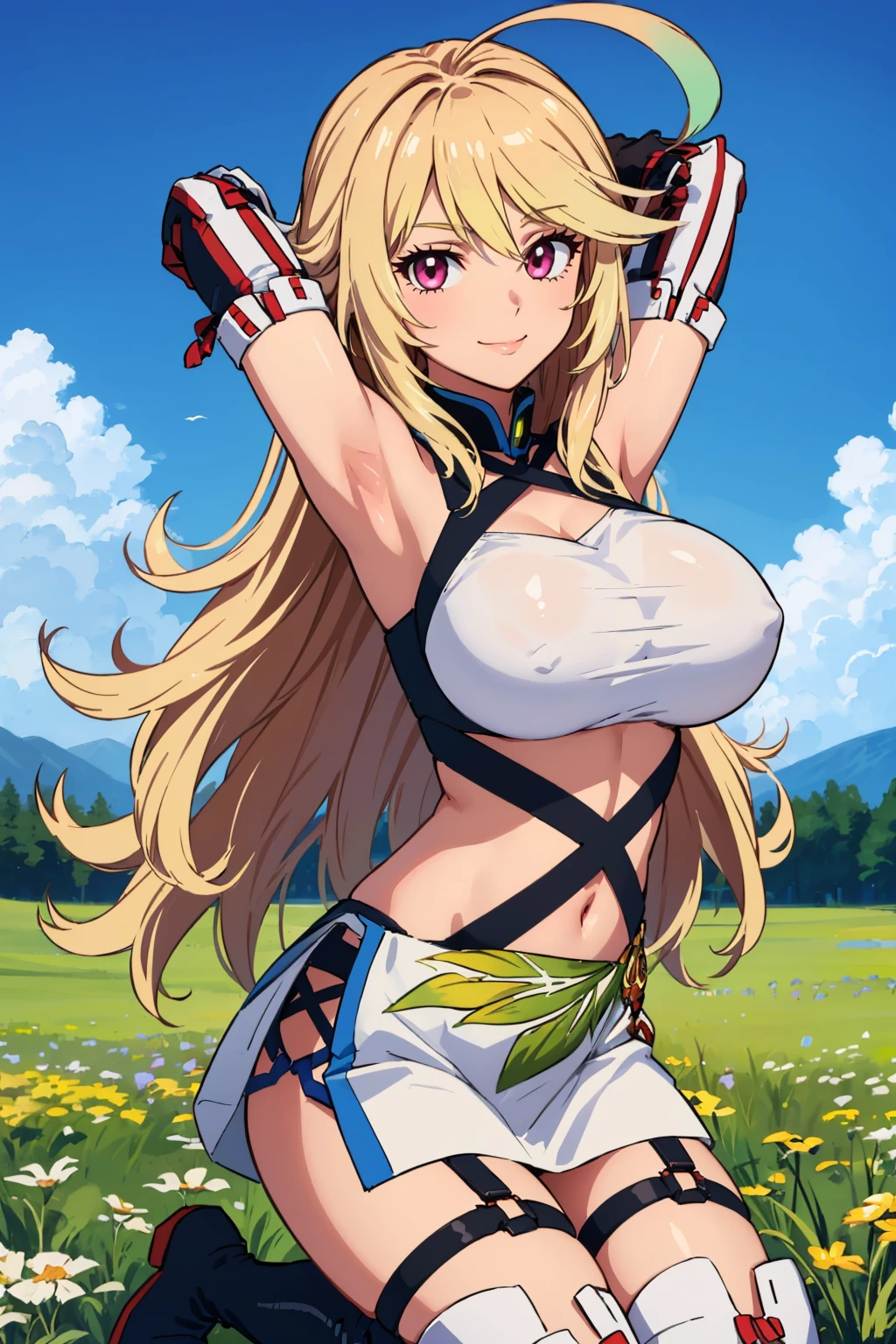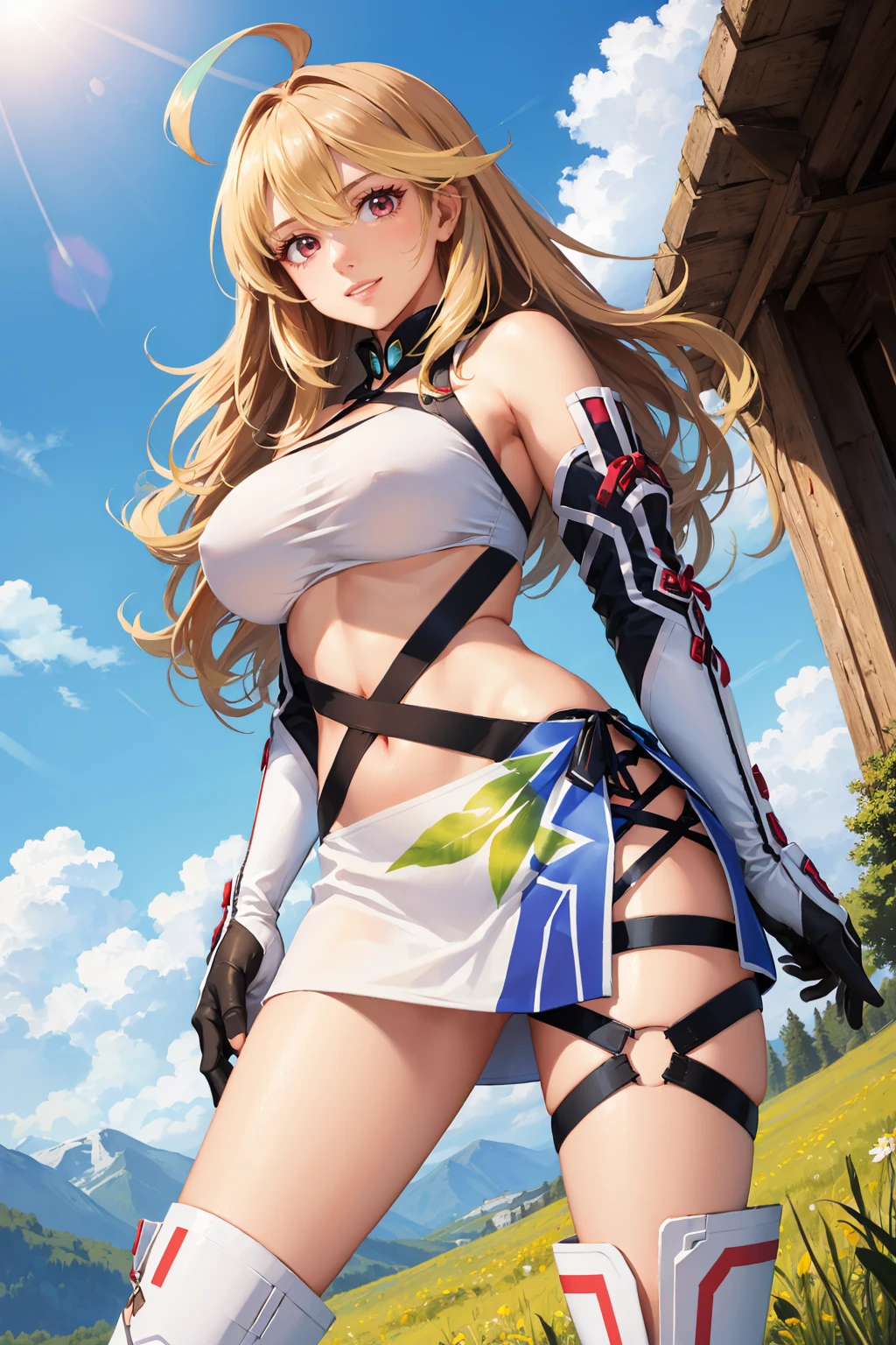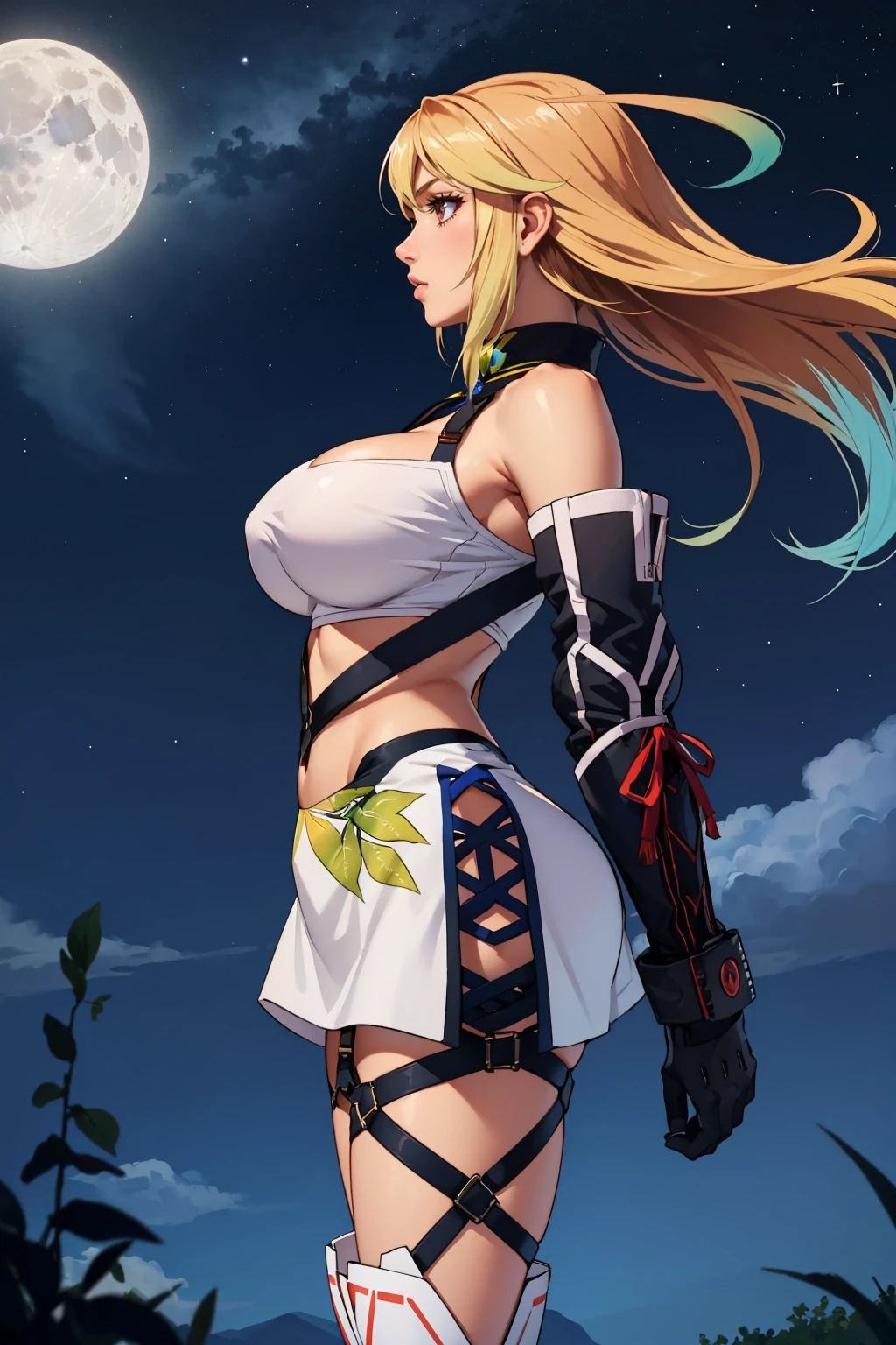 Add "tox1milla, multicolored hair, ahoge, white tube top, black straps, harness, detached sleeves, black sleeves, black gloves, white miniskirt, knee boots" for her Tales of Xillia 1 look.