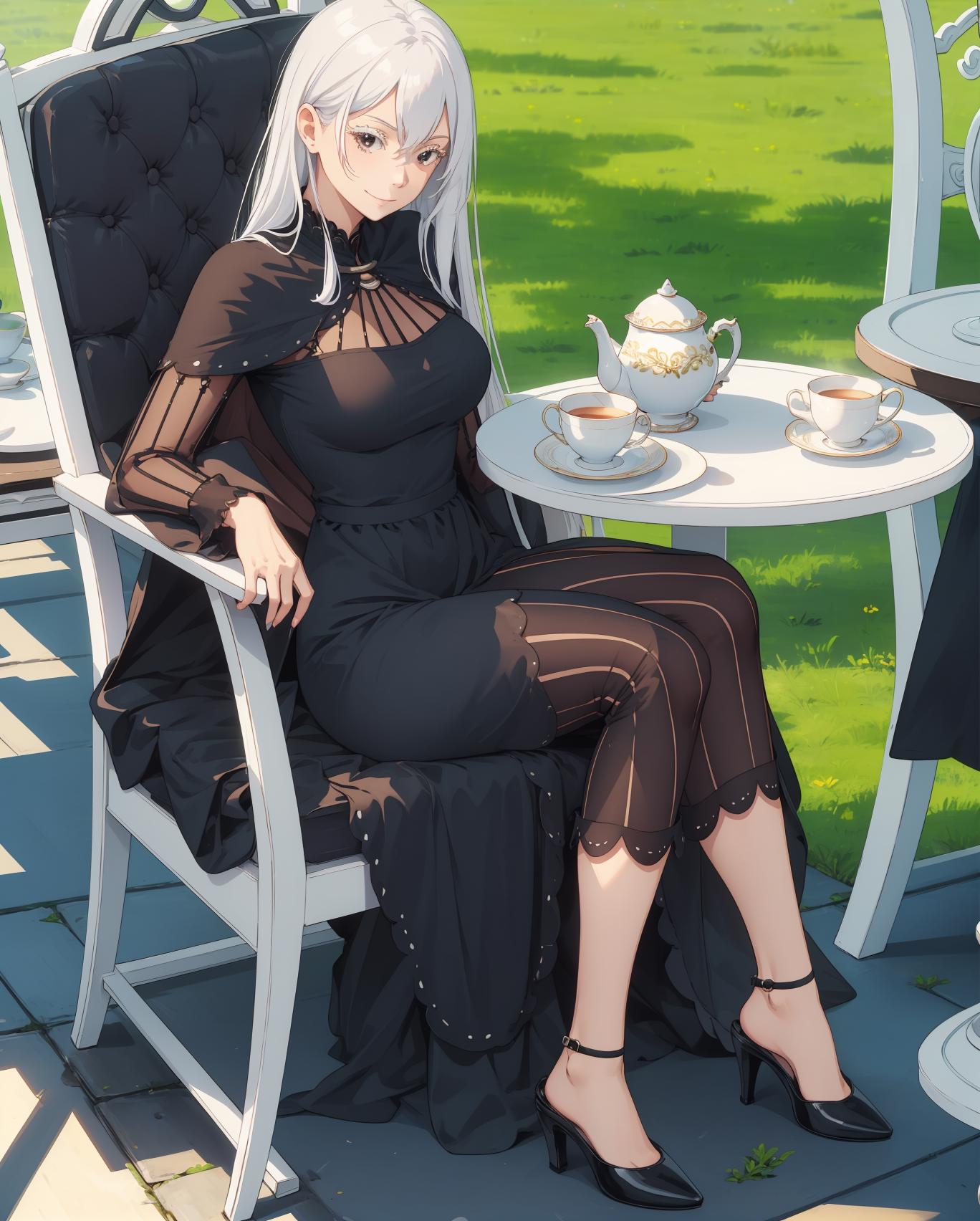 Default outfit: black dress, black capelet, vertical-striped dress, vertical stripes, long sleeves, layered dress.