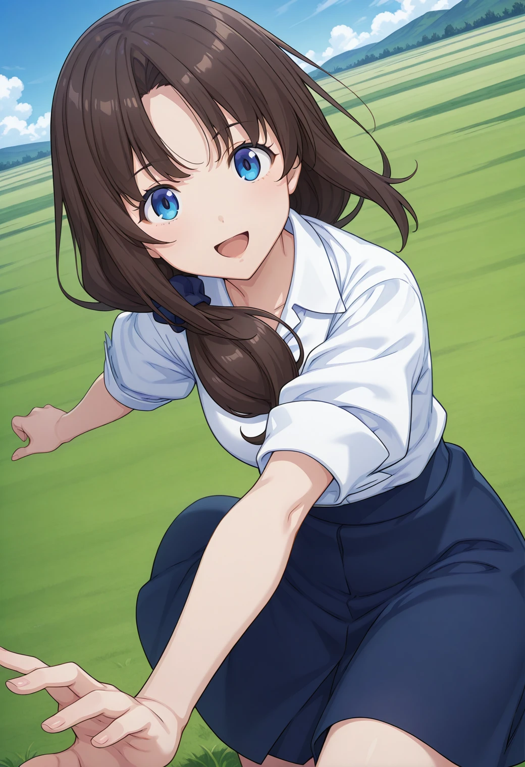 tantei1_ayumi, blue eyes, brown hair, long hair, hair scrunchie, collared shirt, white shirt, blue skirt,