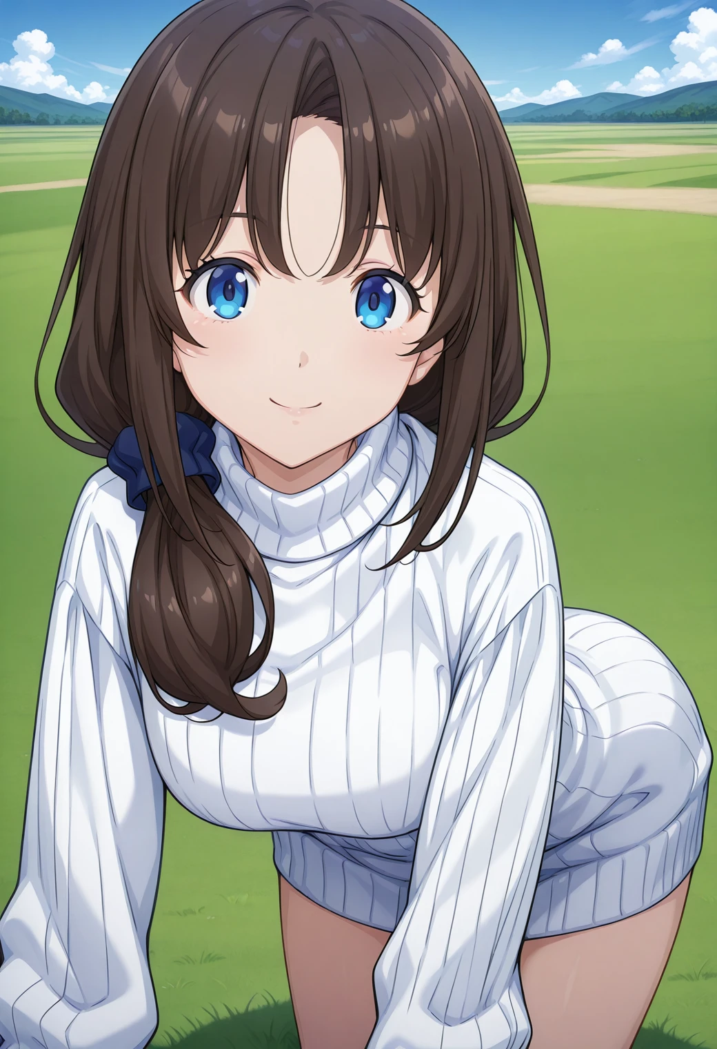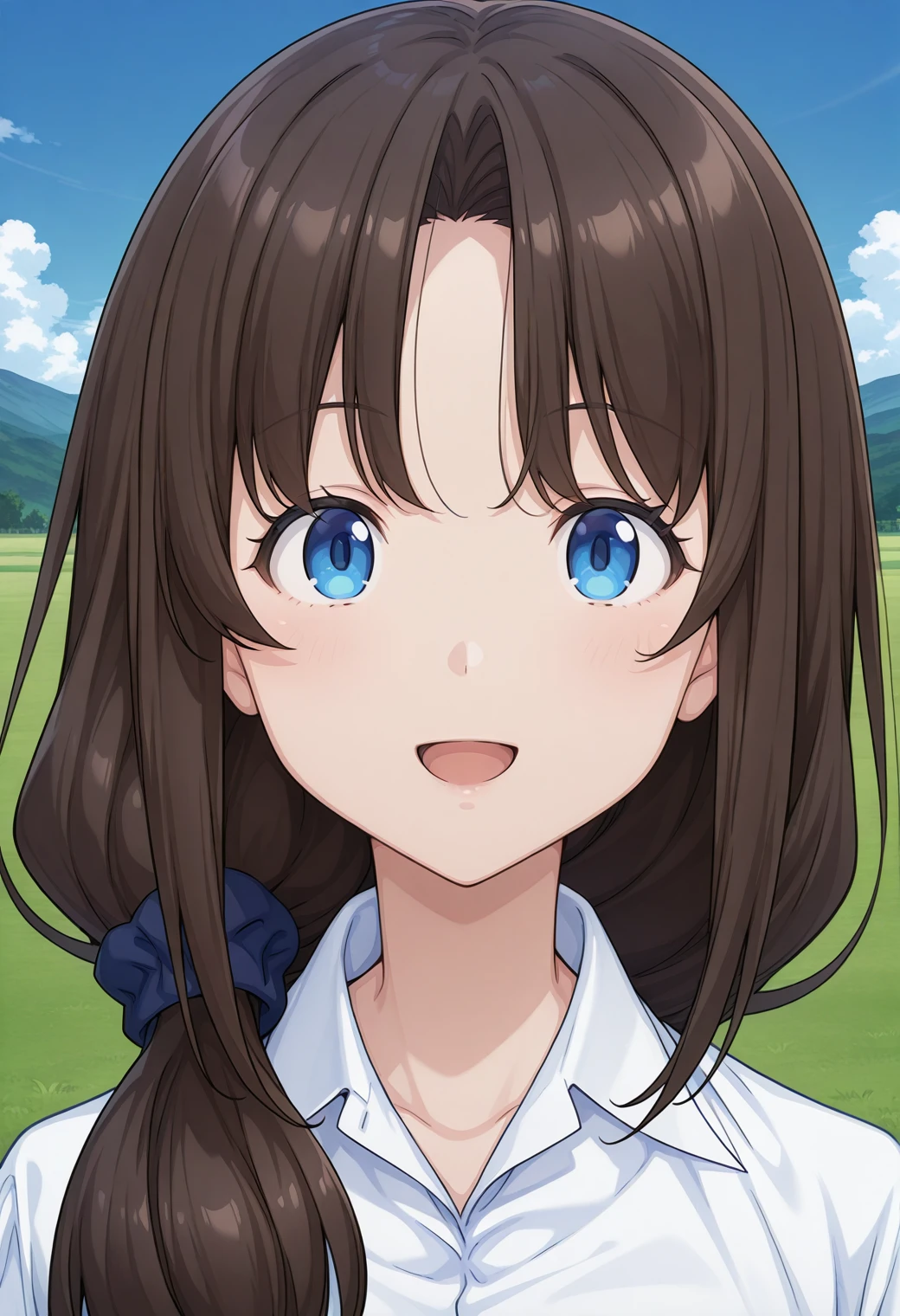 Trigger word: tantei1_ayumi, blue eyes, brown hair, long hair, hair scrunchie