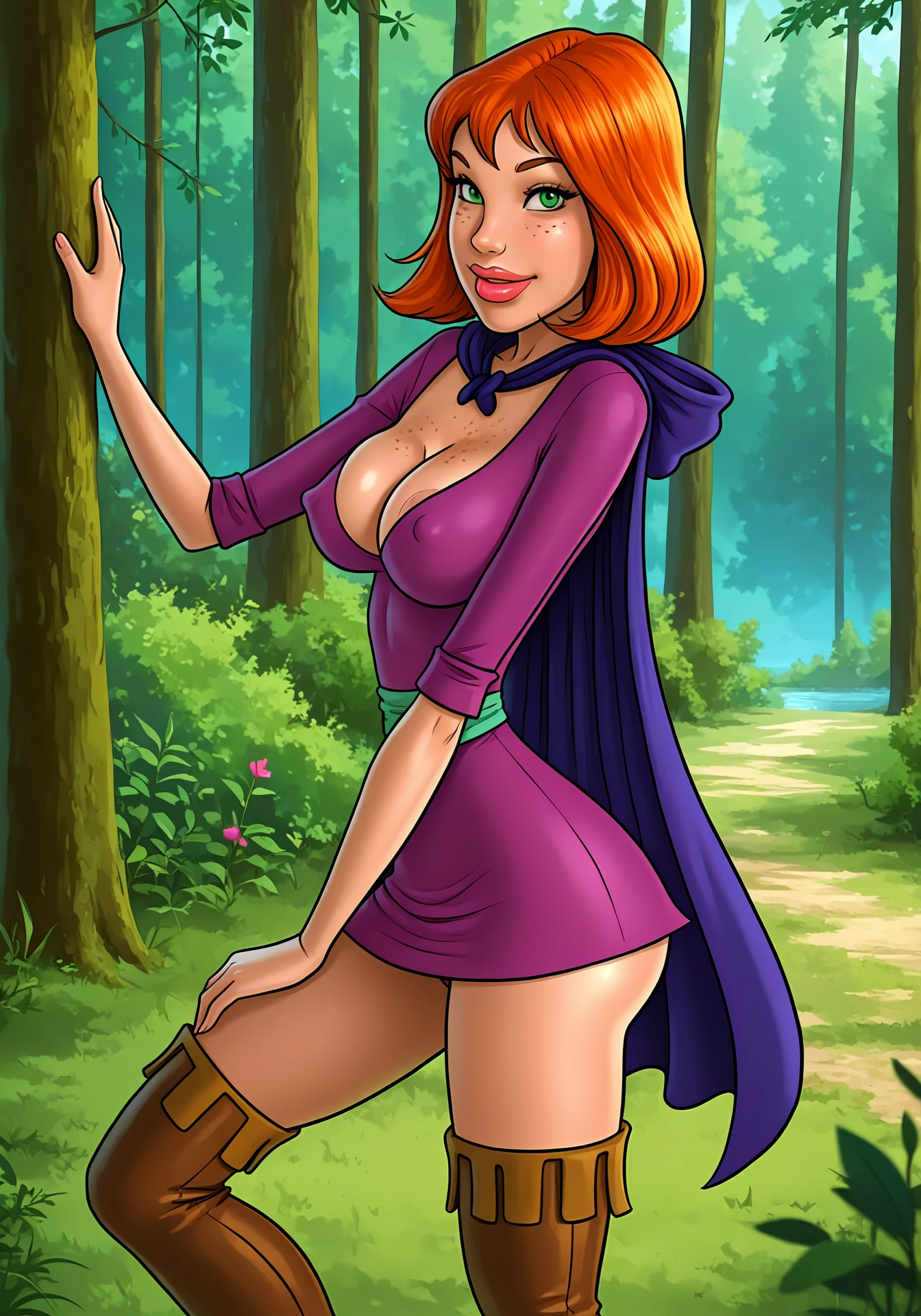 purple dress, purple cape, thigh boots, cleavage