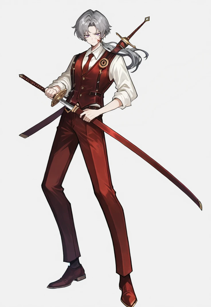 white shirt, red necktie, red vest, dark red gloves, red pants, dark red footwear