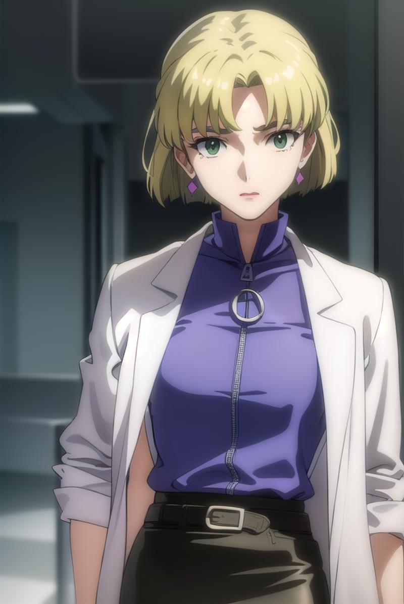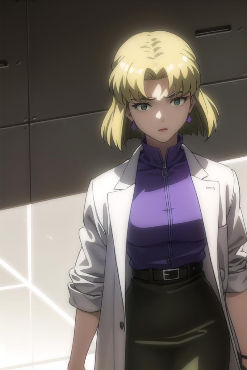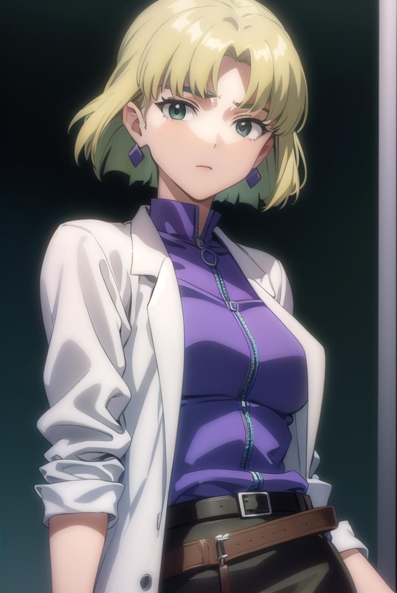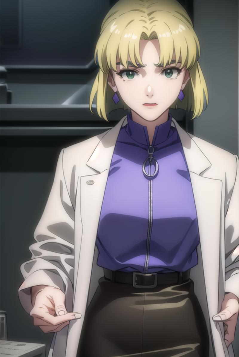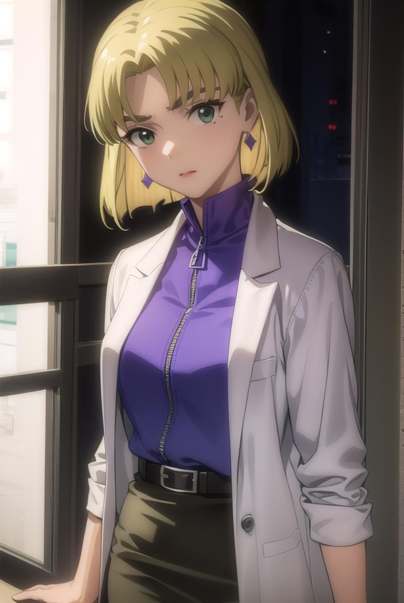 ritsuko akagi, short hair, blonde hair, mole, mole under eye, (parted bangs:1.5), (green eyes:1.5),