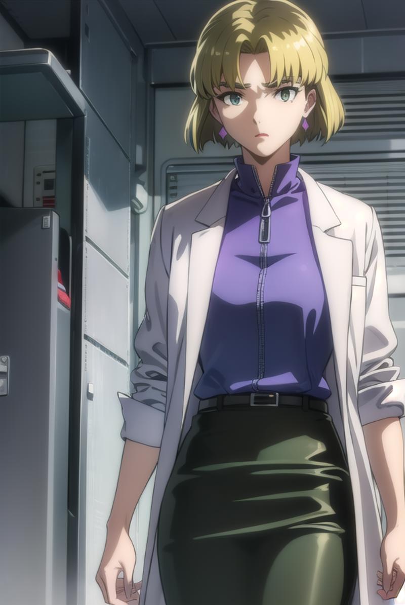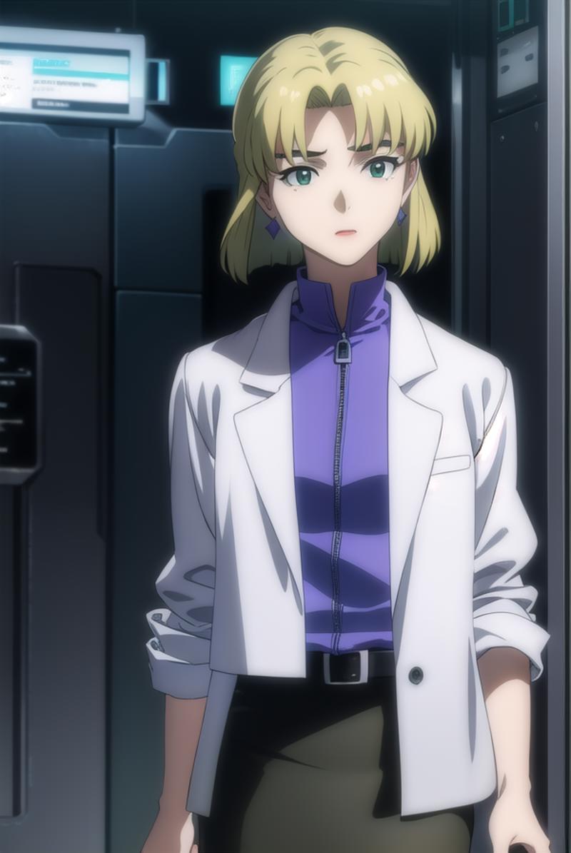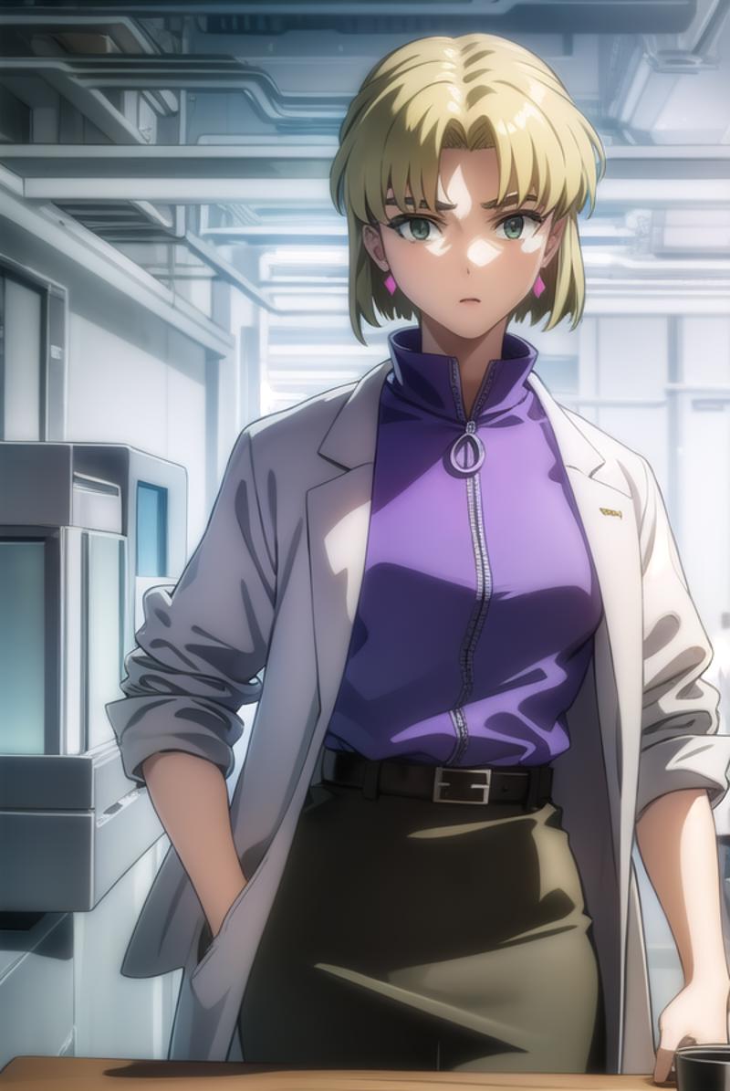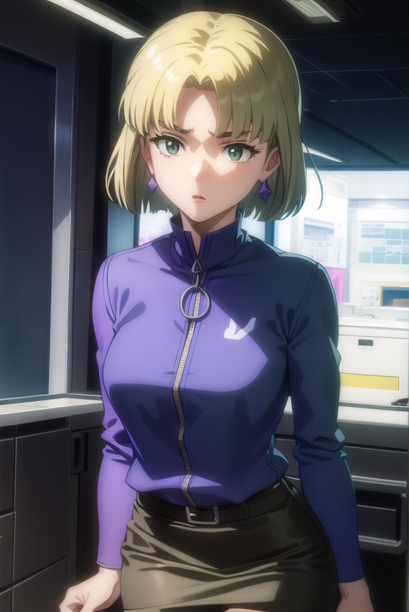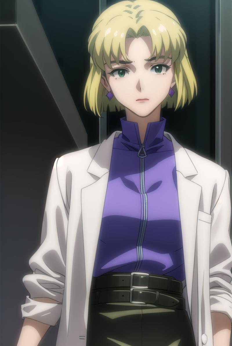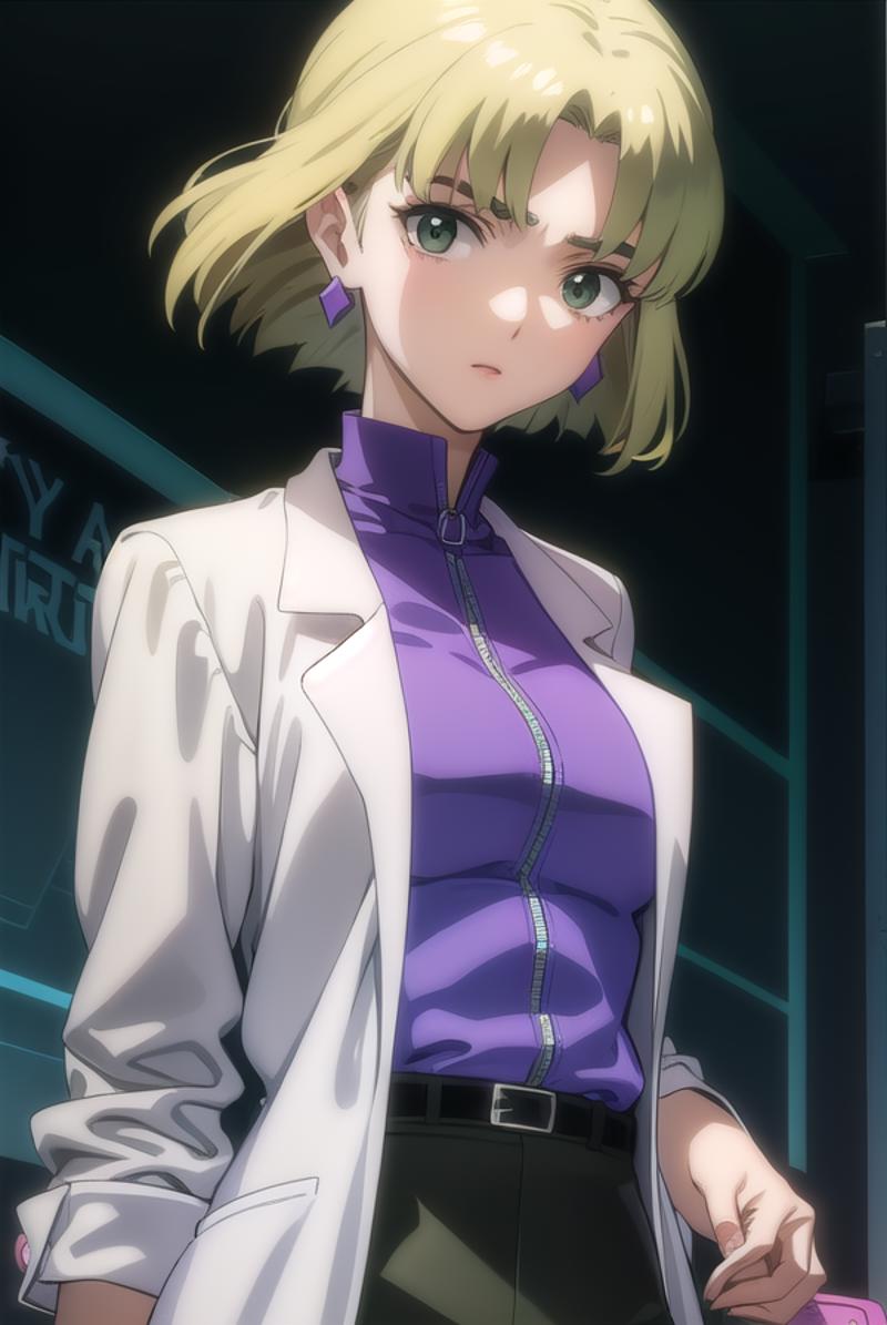 ritsuko akagi, short hair, blonde hair, mole, mole under eye, (parted bangs:1.5), (green eyes:1.5),