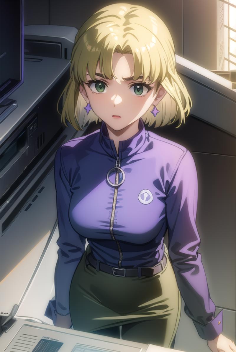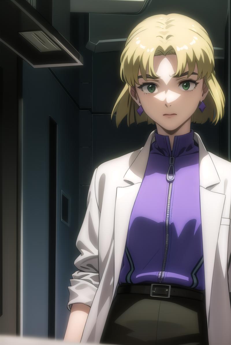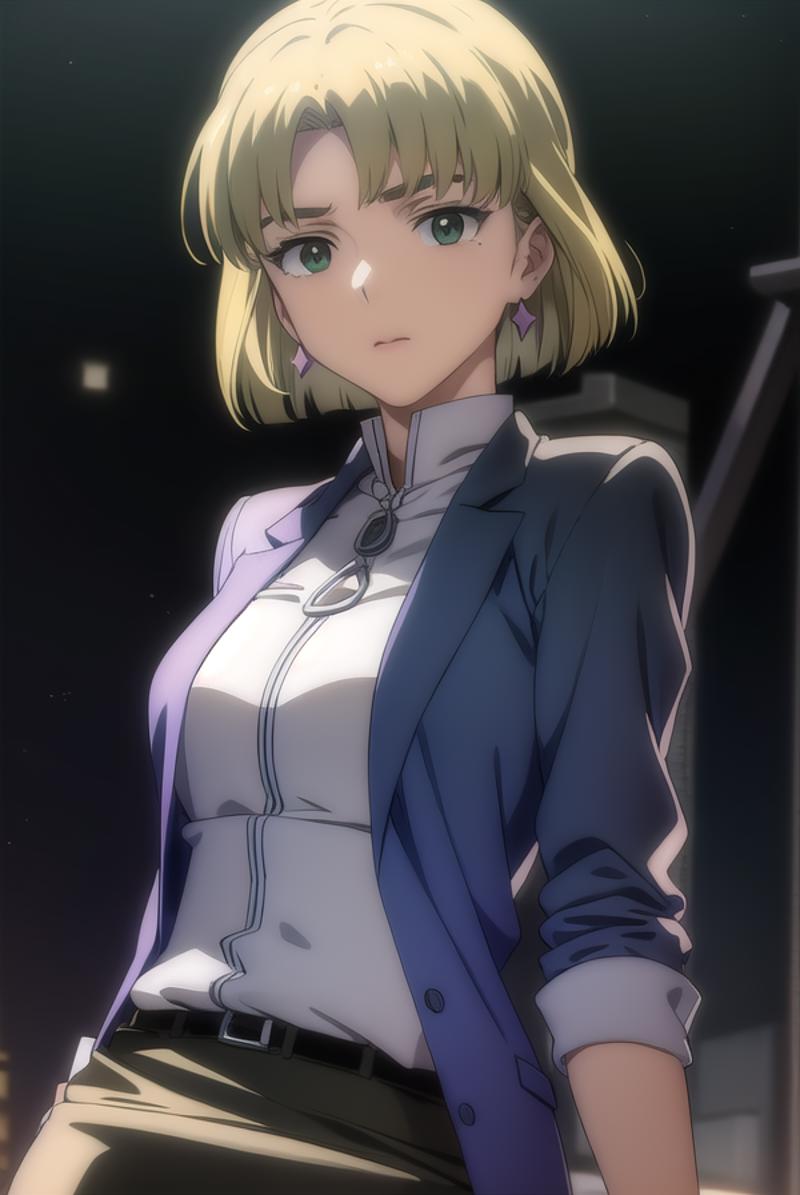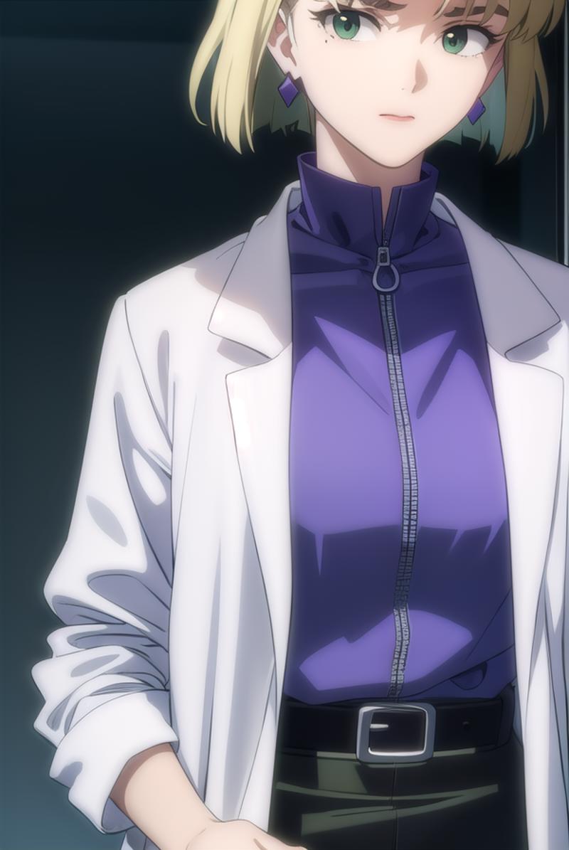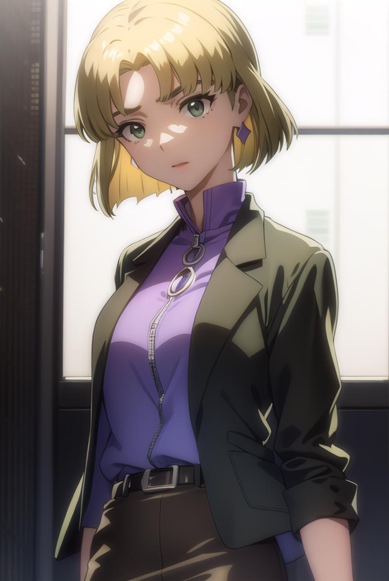 ritsuko akagi, short hair, blonde hair, mole, mole under eye, (parted bangs:1.5), (green eyes:1.5),