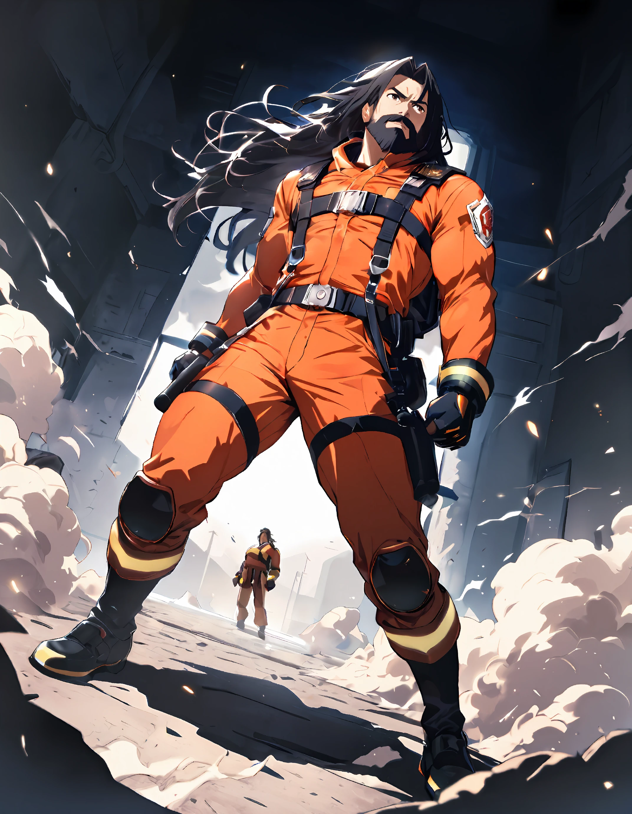 Pierre Blanc, a French boy, masculine, hairy, with a beard and long hair. He is a firefighter.