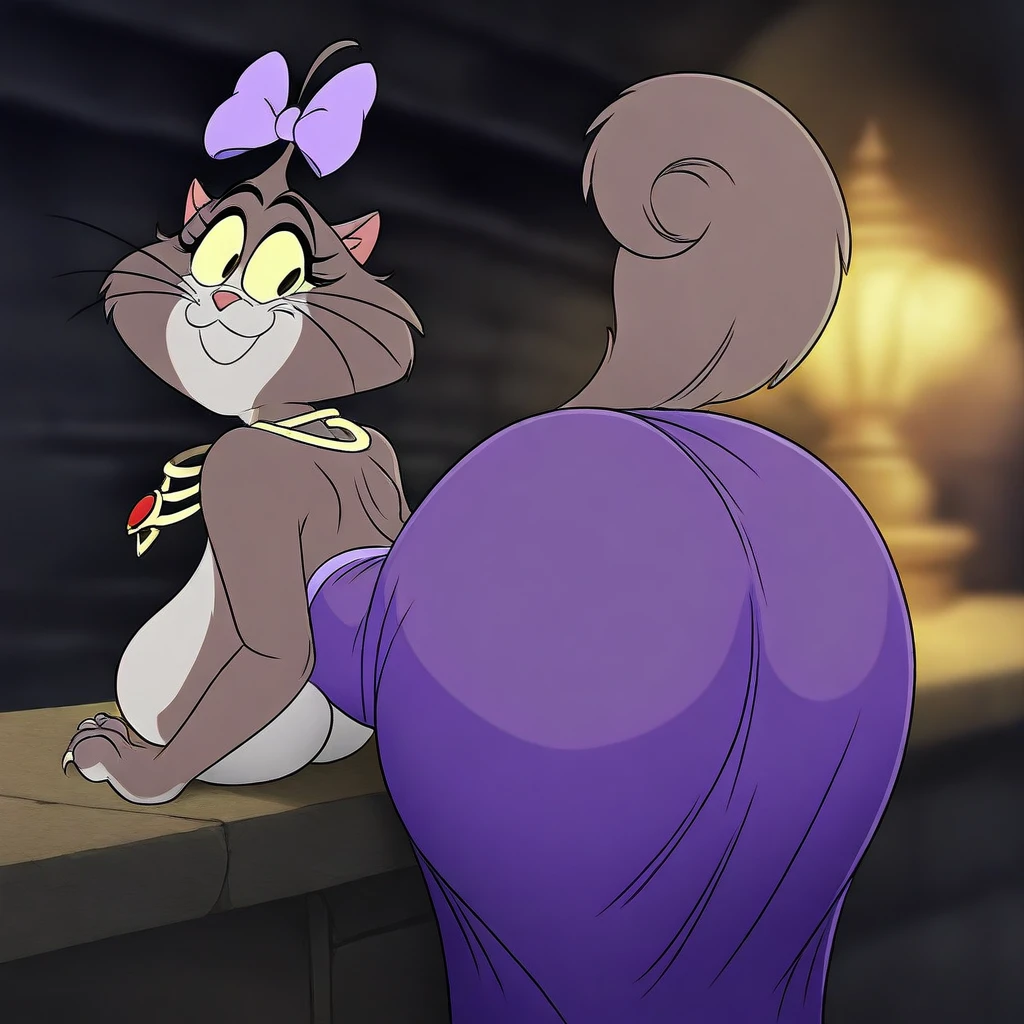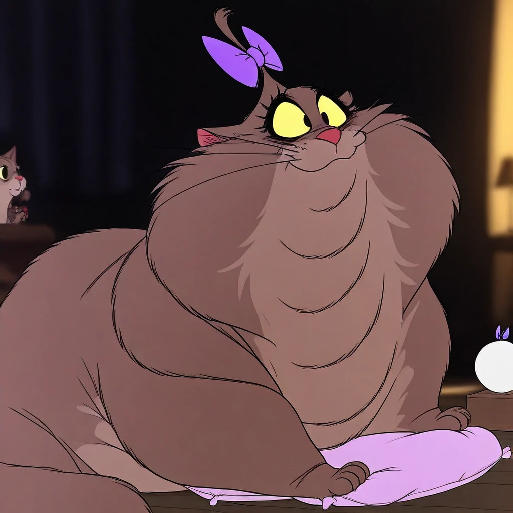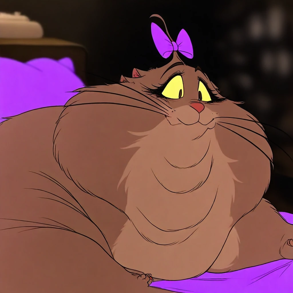 obese, overweight, cat, pink bow in hair, yellow eyes, beige fur