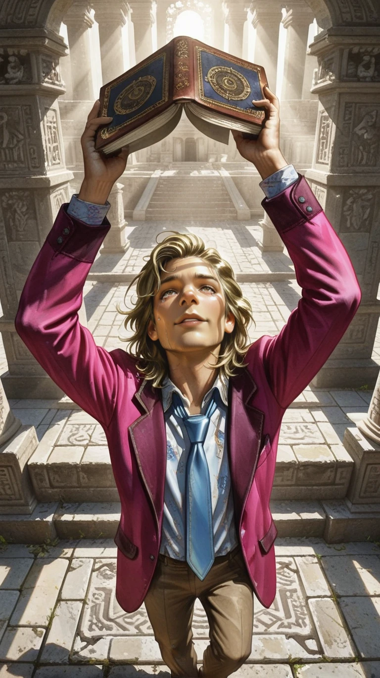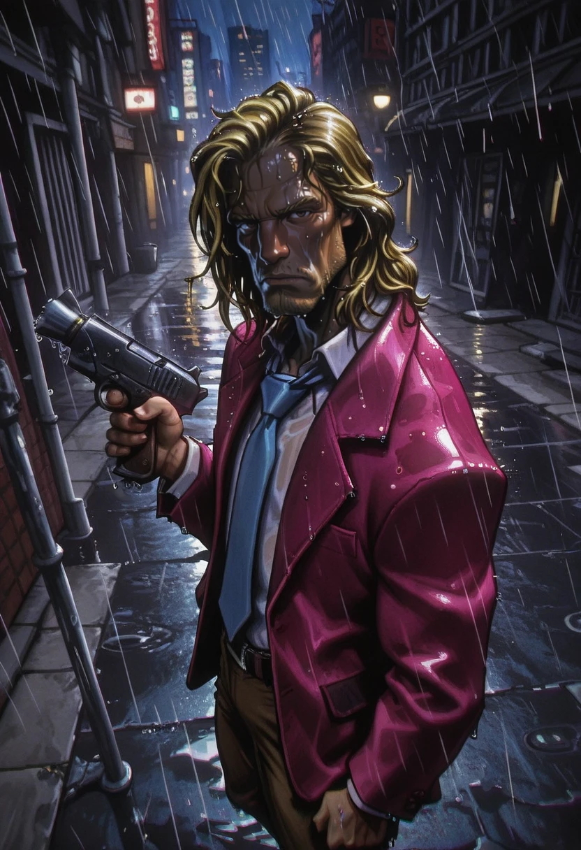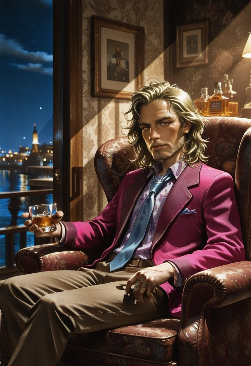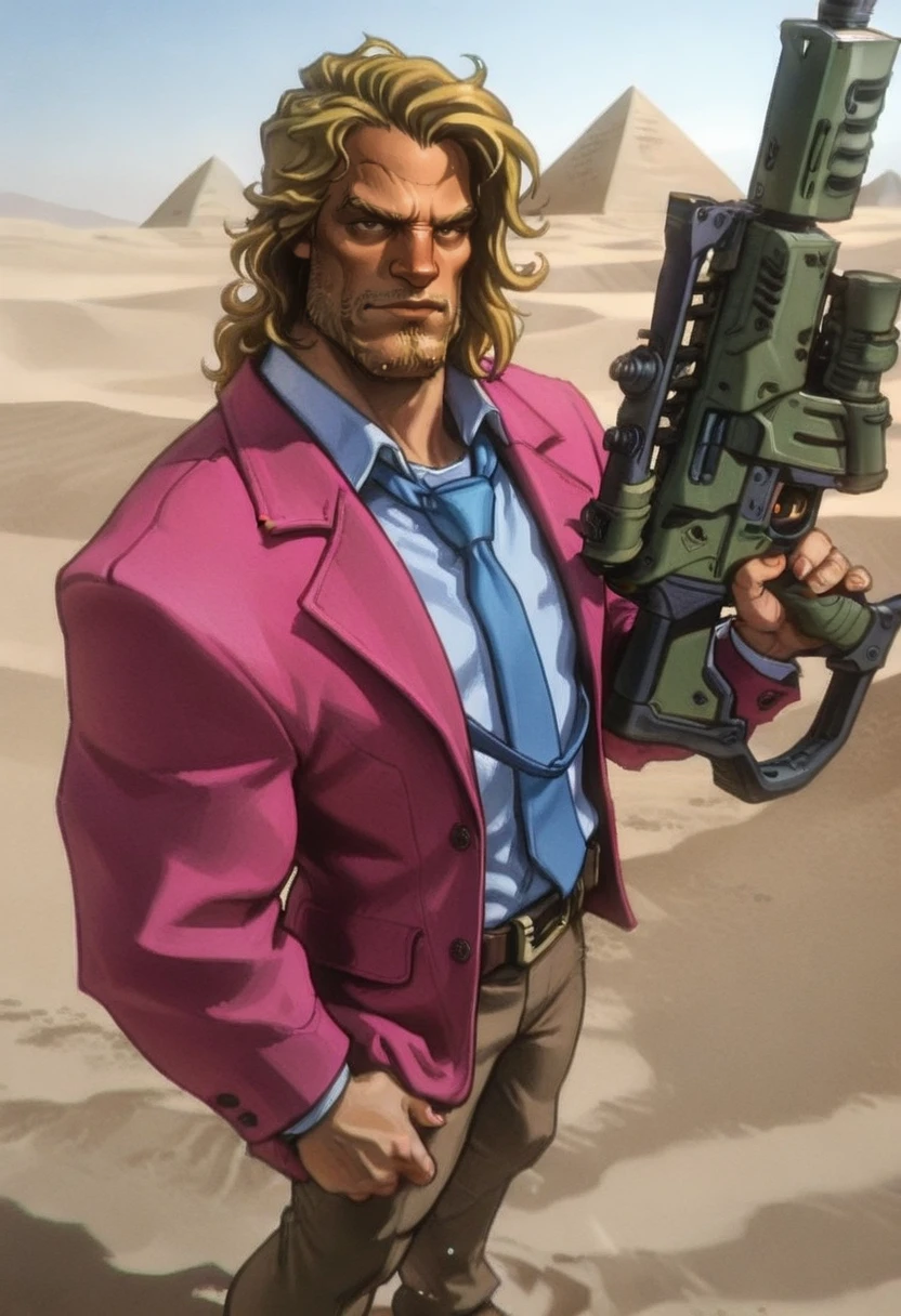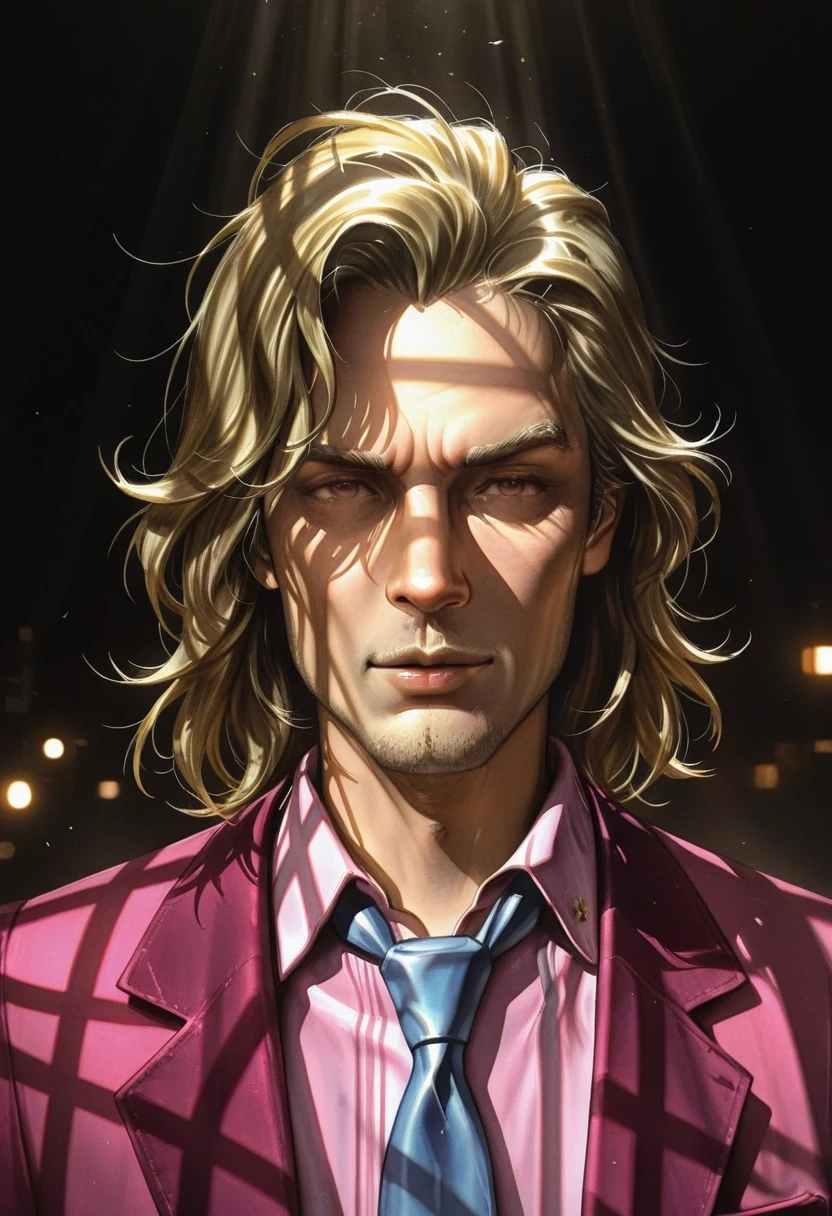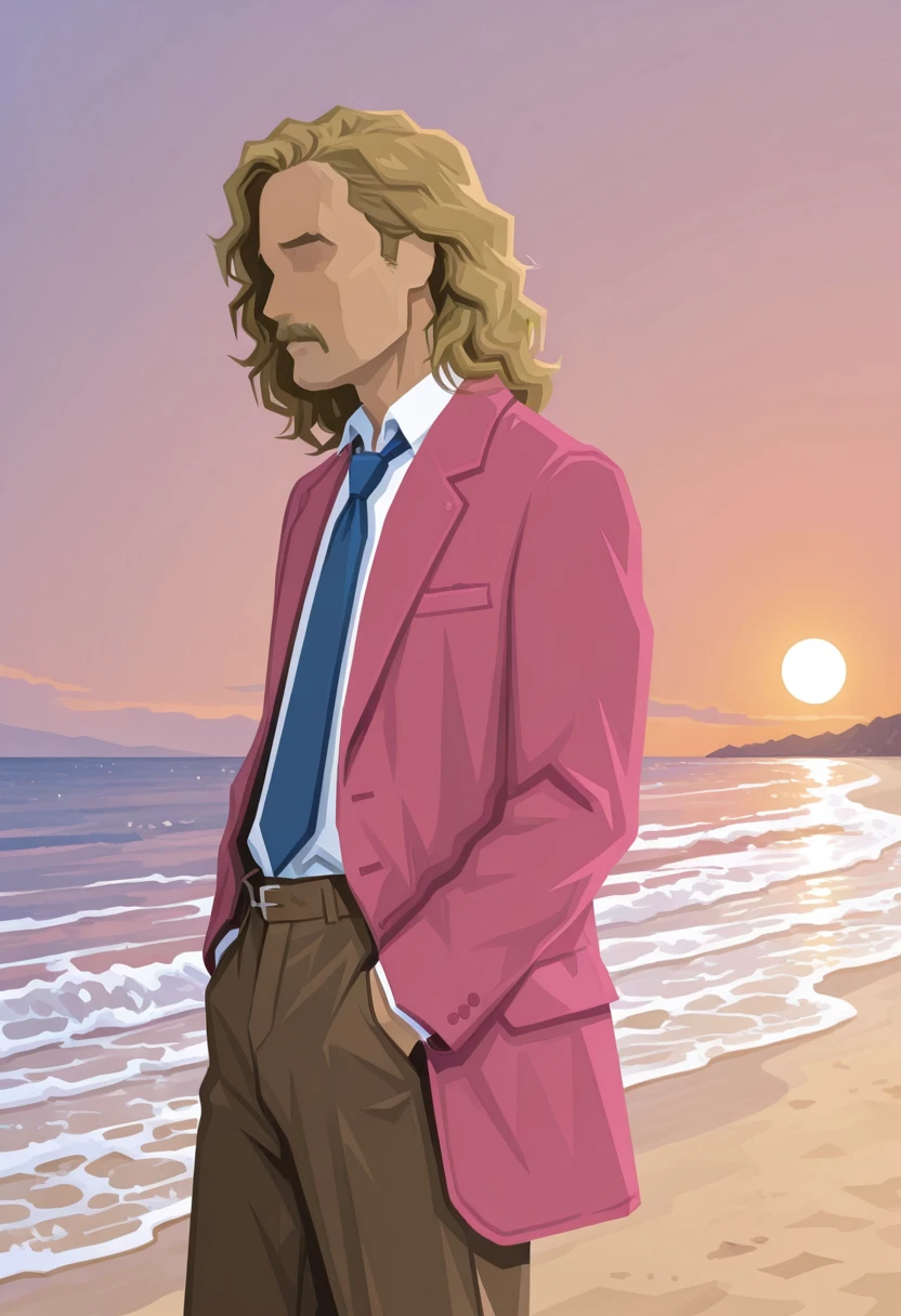 formal, pink jacket, , loose necktie, blue necktie, brown pants,