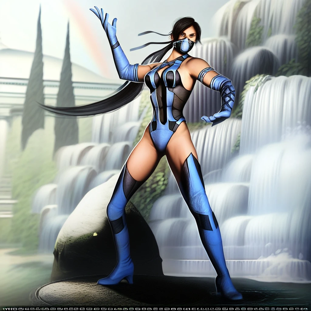 For her appearance in game, use these prompts: 1girl, solo, black hair, ponytail, brown eyes, breasts, elbow gloves, black and blue leotard, mouth mask, thigh boots, thighhighs, blue boots, blue gloves