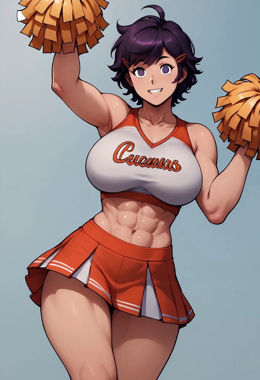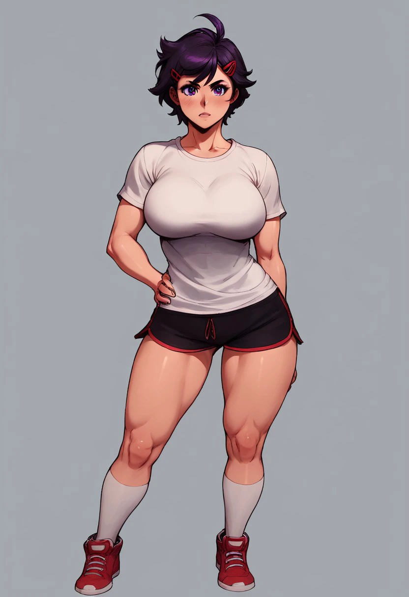 1 girl, Jane, Short hair, brushed bangs, hairclip, tall girl, muscular, abs, short hair, dark hair, purple eyes