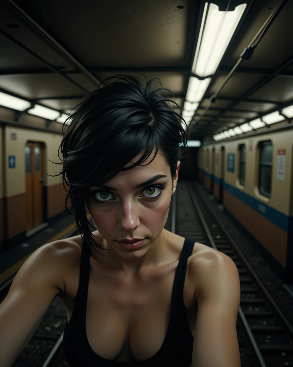subwayselfie, dramatic, young woman, short hair, spiky hair, black hair, green eyes, piercing eyes, dimly lit, abandoned subway tunnel, crumbling brick walls, fluorescent lights, flickering lights, realistic, selfie, alone, deserted, score_9, score_8_up, score_7_up