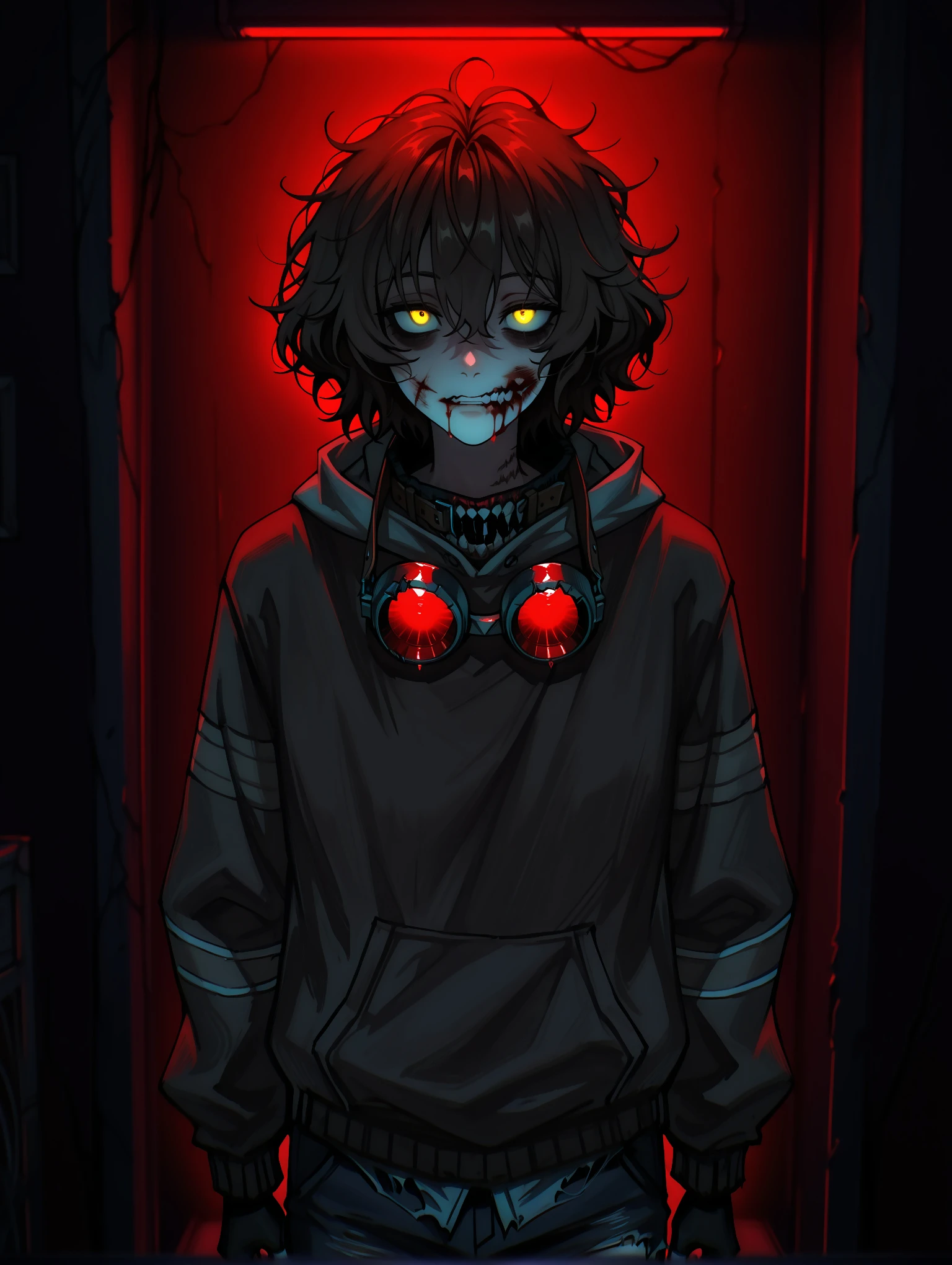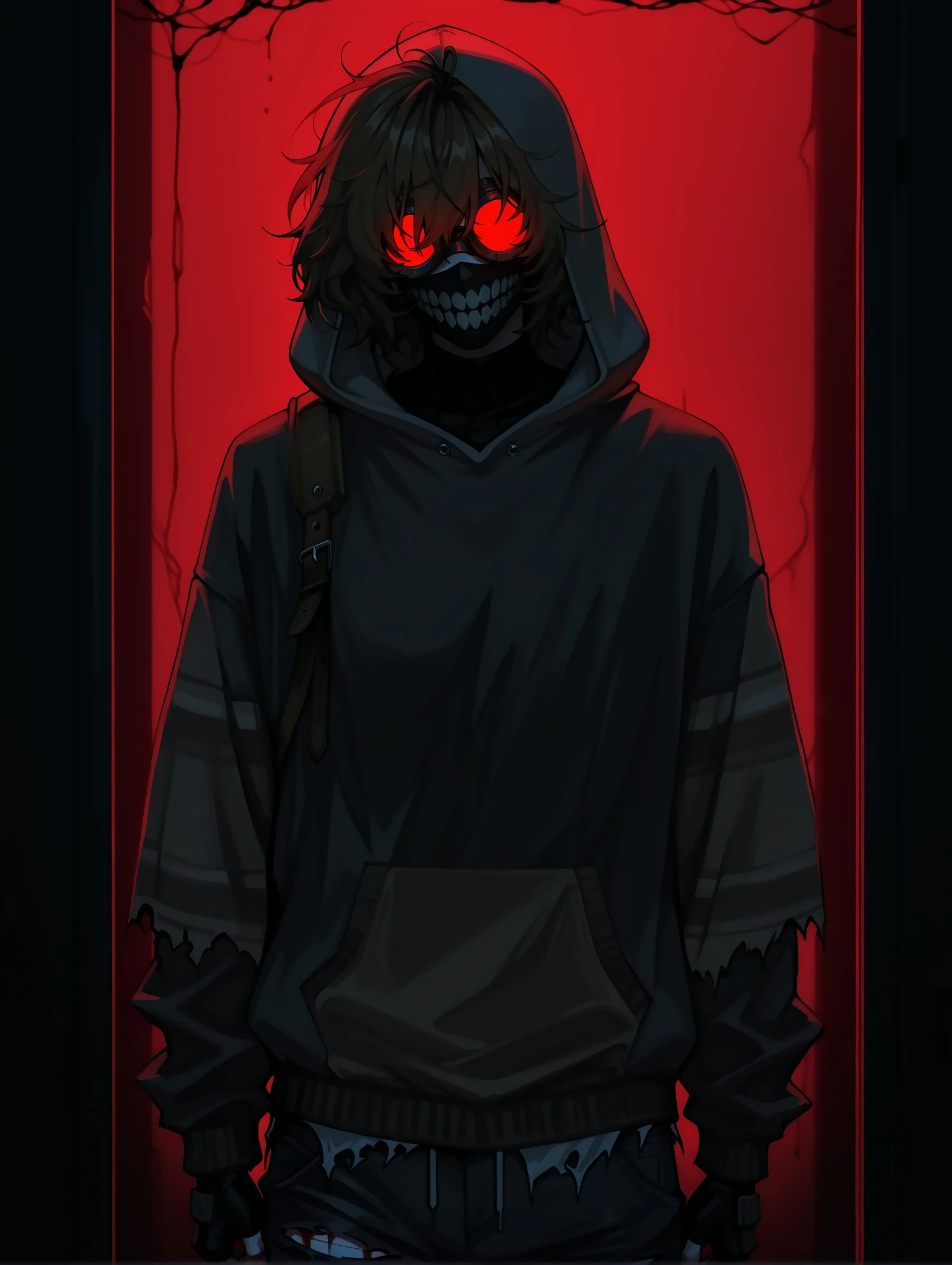 Outfit Prompts : hood, mask, mouth mask, goggles, gloves, pants, black gloves, fingerless gloves, sweater, striped, long sleeves, hood up, torn clothes