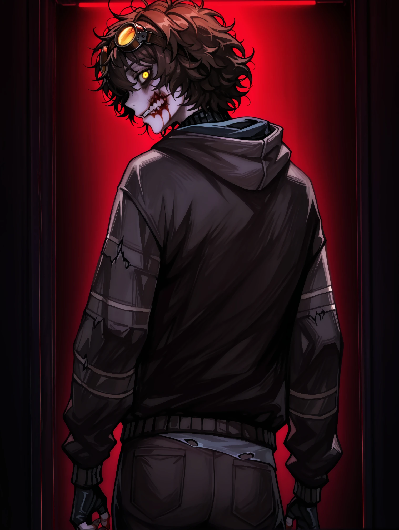 Outfit Prompts : hood, goggles around neck, gloves, pants, black gloves, fingerless gloves, sweater, striped, long sleeves, hood down, torn clothes