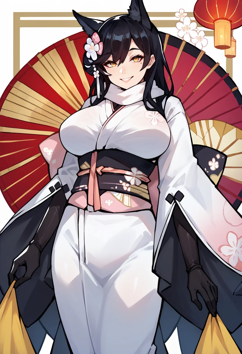 - mlatagowkim, black gloves, black hair, floral print, hair flower, japanese clothes, large breasts, long hair, mole under eye, obi, print kimono, smile,