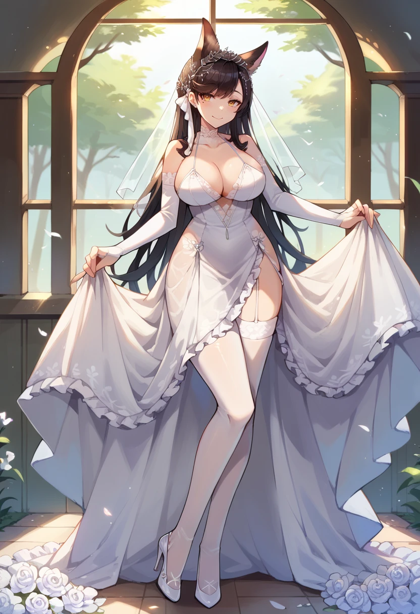 • Lily-White Vow (Wedding Skin): mlatagowed, bare shoulders, black hair, bridal gauntlets, cleavage, extra ears, large breasts, long hair, mole under eye, smile, stiletto heels, swept bangs, wedding dress