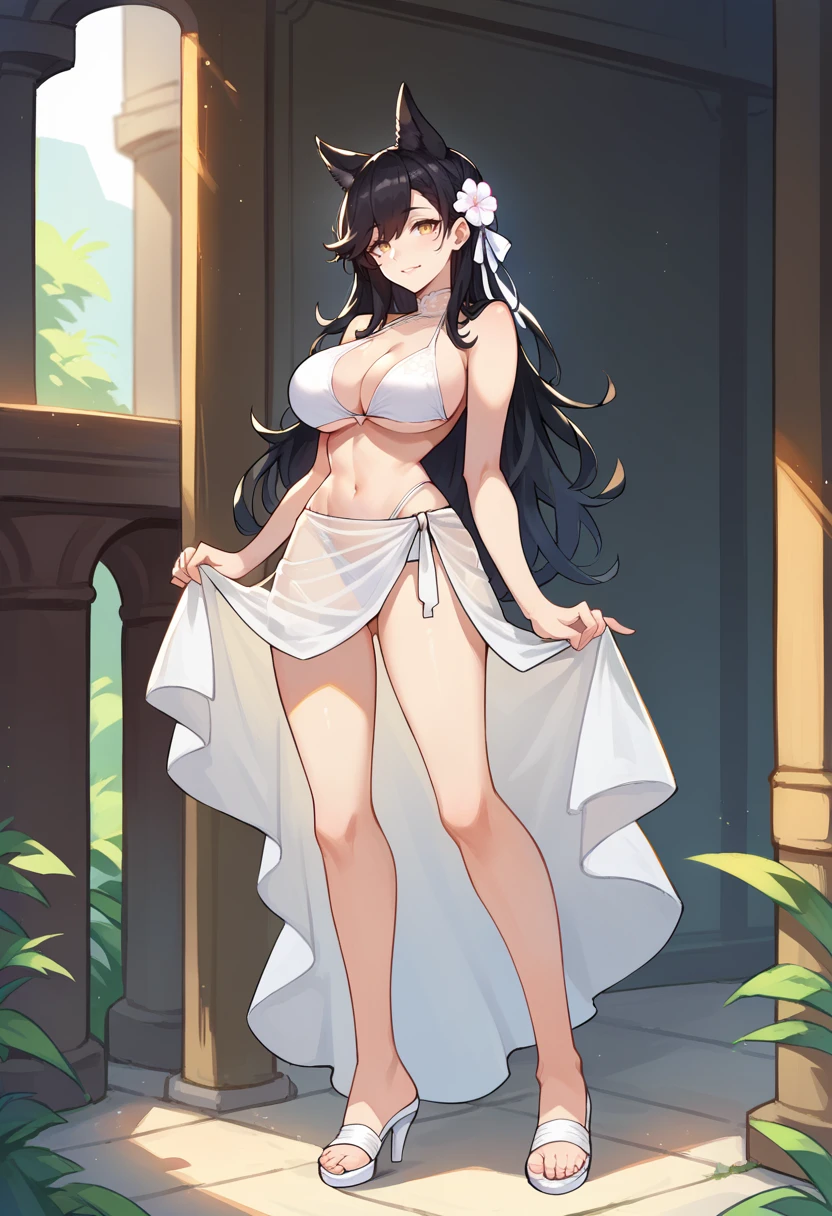 mlatagosmrch, black hair, extra ears, large breasts, very long hair, mole under eye, white bikini, white sarong, heeled sandals, hair flower, yellow eyes,
