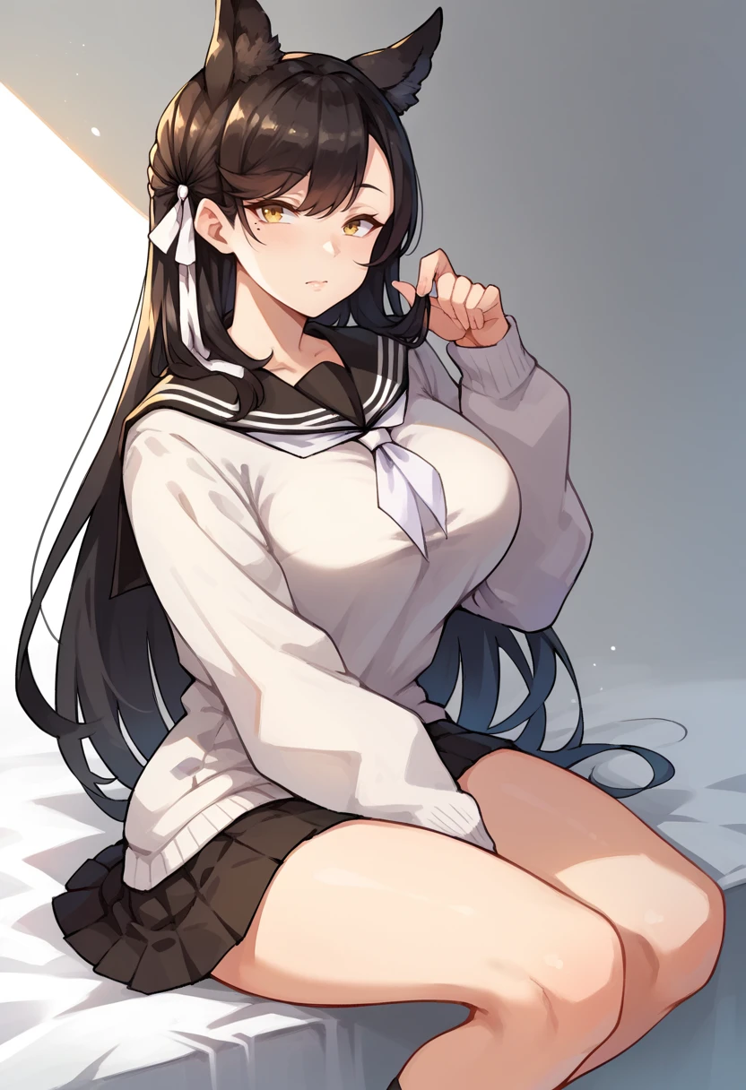 • School Traumerei (school uniform): mlatagotram, black hair, black undershirt, extra ears, hair ribbon, large breasts, long hair, mole under eye, serafuku, swept bangs, yellow eyes