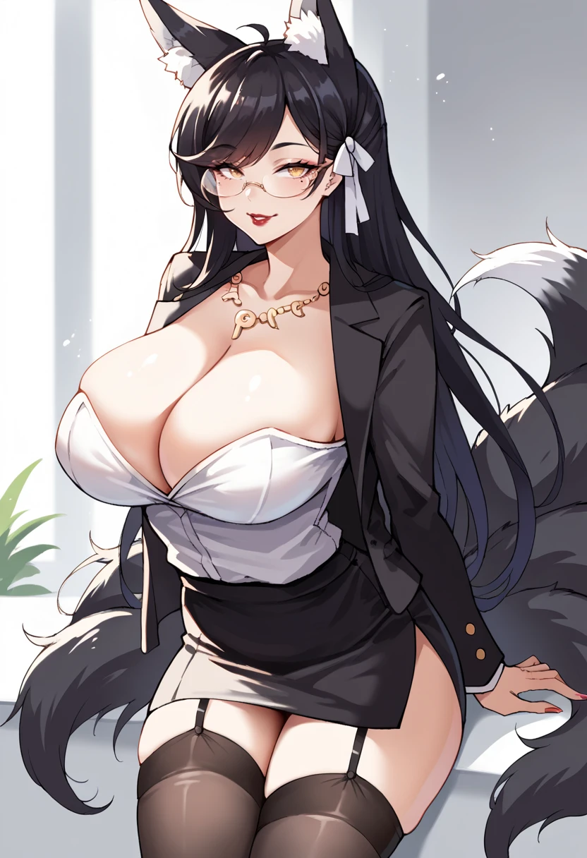 mltagobase, black hair, black thigh highs, extra ears, garter straps, large breasts, miniskirt, white uniform, high heels, white shoes