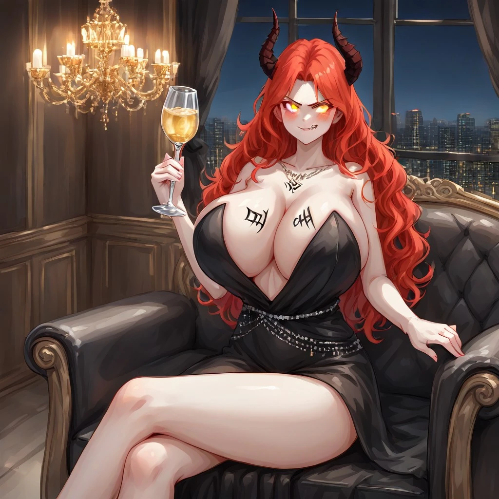 high_quality, masterpiece, bare_feet, watercolor_style, traditional_media_simulation, painterly, soft_shading, detailed_hair_lineart, loose_strokes, expressive_linework, soft_edges, harmonious_color_palette, 1girl, solo, reinadms, demon_girl, black_curved_horns, long_red_hair, messy_hair, wavy_hair, distinct_hair_strands, fair_skin, yellow_eyes, glowing_eyes, huge_breasts, black_text_on_breasts, korean_text, skin_tattoo, smirk, biting_lip, subtle_fang, confident_expression.