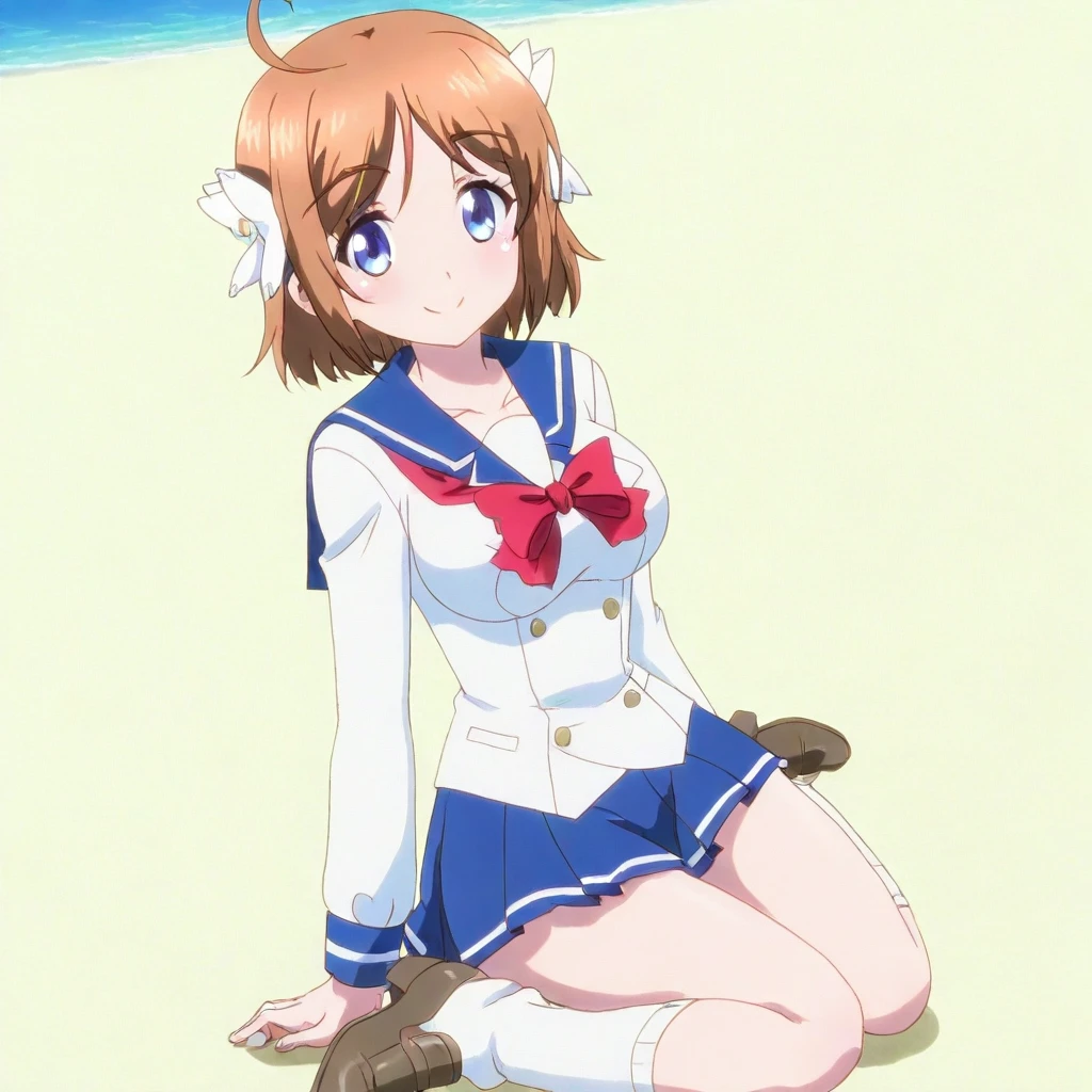 sakura hane \(bakuon\), light brown hair, short hair, blue eyes, ahoge, bangs, hair ornaments, blue and white school uniform, bow, skirt, socks, heels, large breasts, 1girl, solo