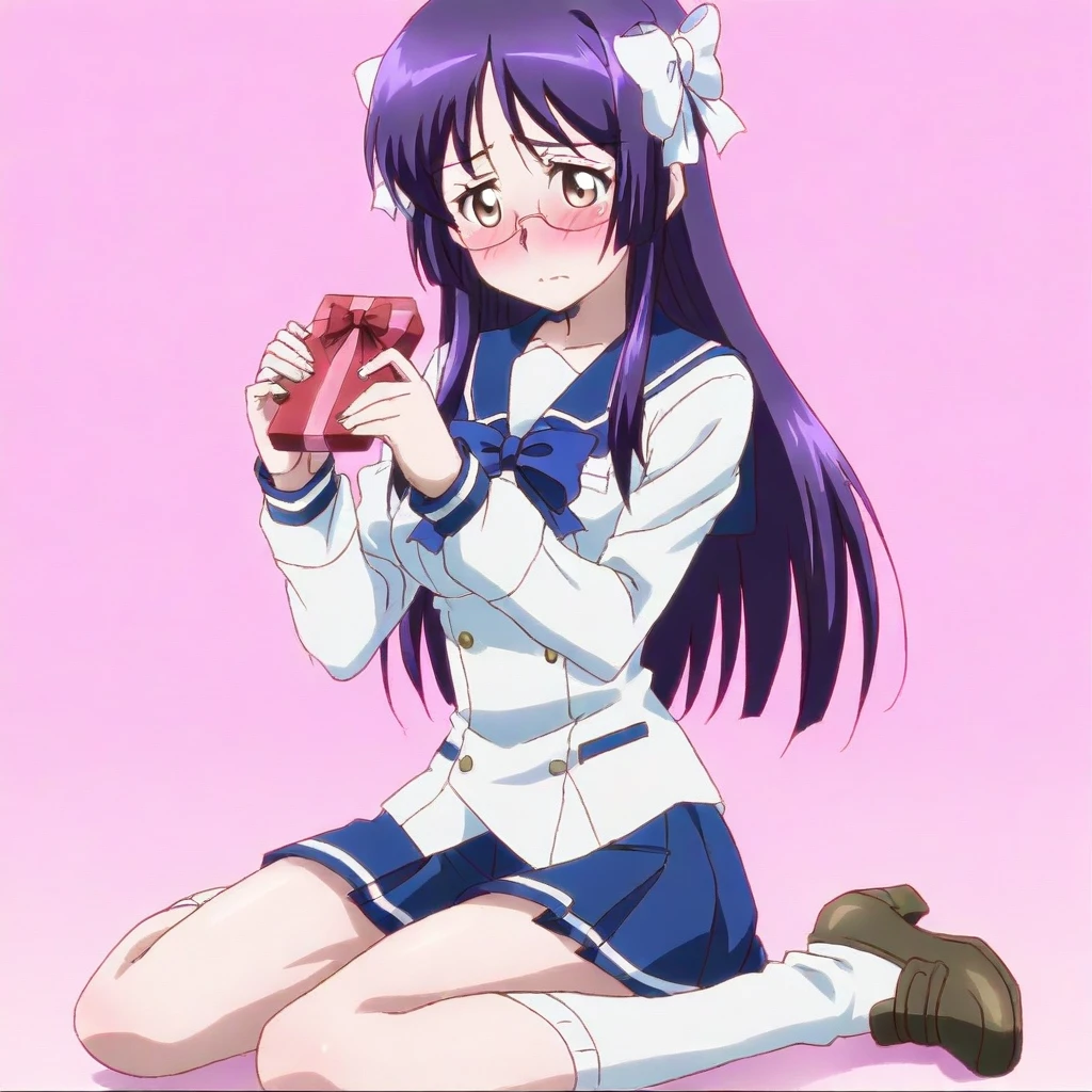minowa hijiri \(bakuon\), dark purple hair, long hair, bangs, hair ornaments, brown eyes, eyeglasses, blue and white school uniform, bow, skirt, socks, heels, large breasts, 1girl, solo
