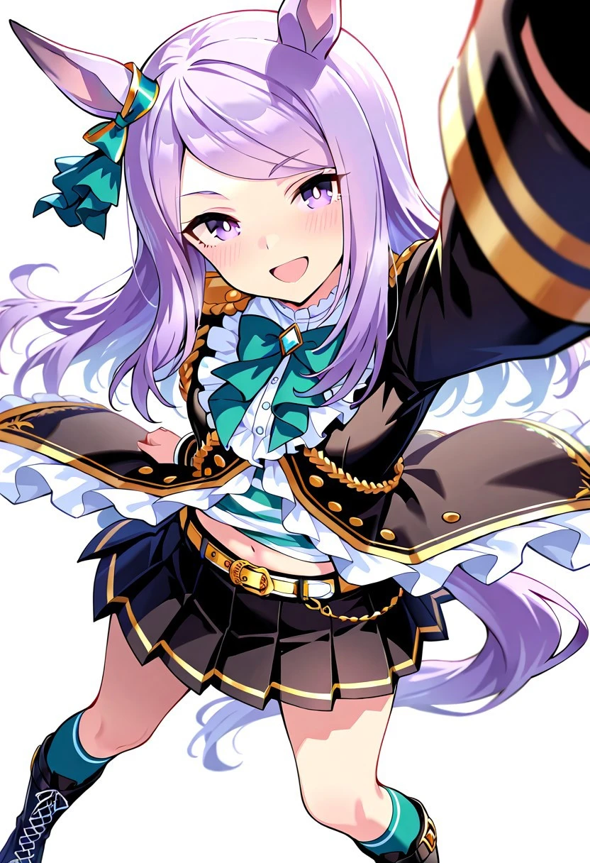 tracen school uniform, sailor collar, sailor shirt, purple shirt, puffy short sleeves, puffy sleeves, purple bowtie, white skirt, pleated skirt, miniskirt, frilled skirt, frills, white thighhighs, zettai ryouiki, brown footwear, shoes, horseshoe ornament, summer uniform, serafuku
