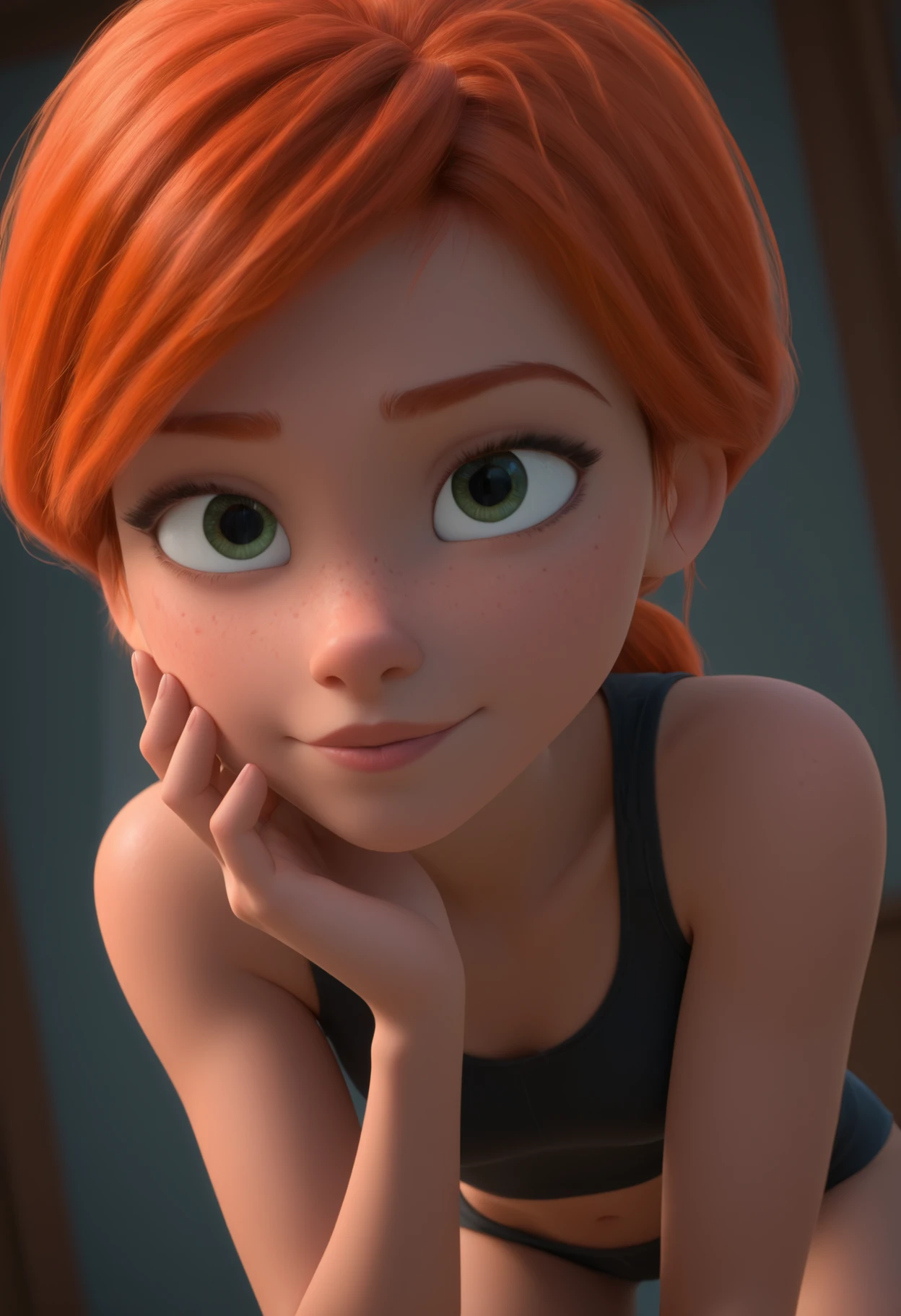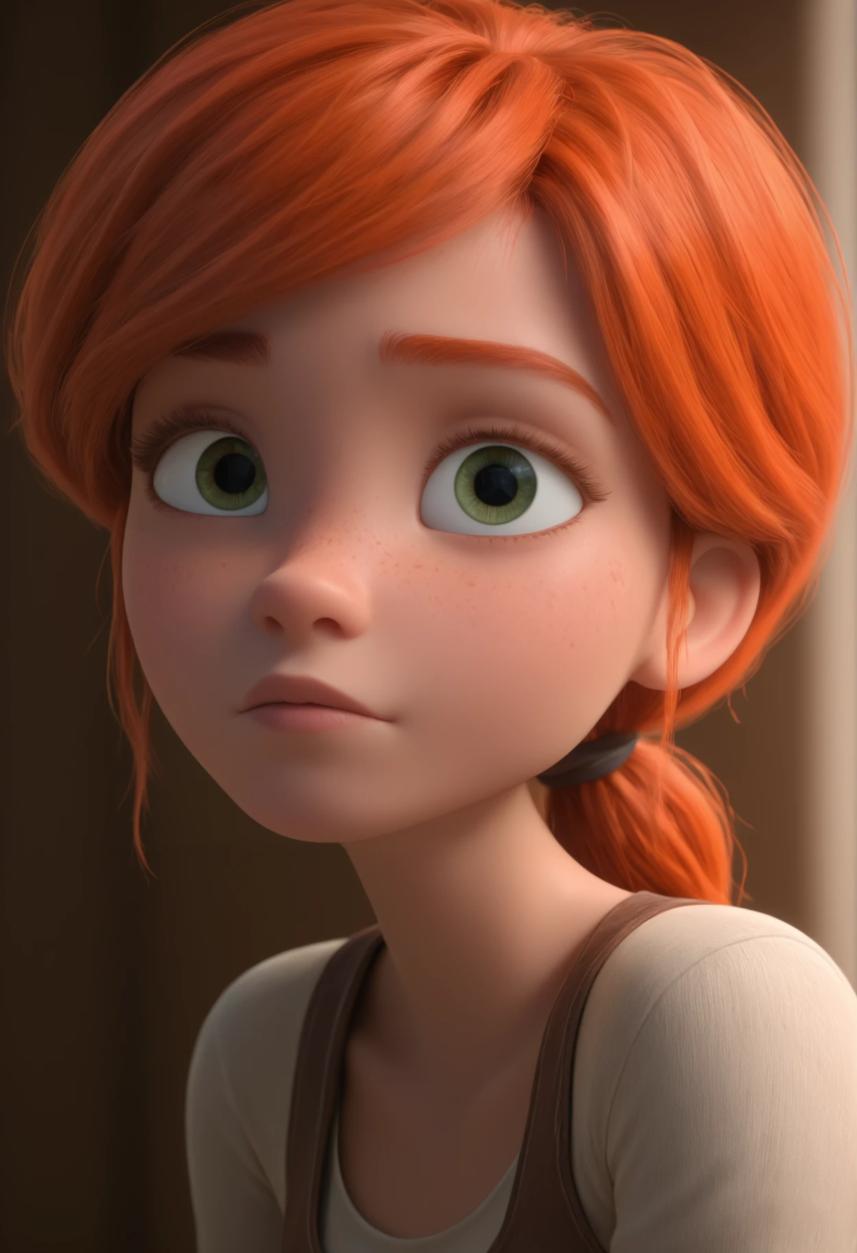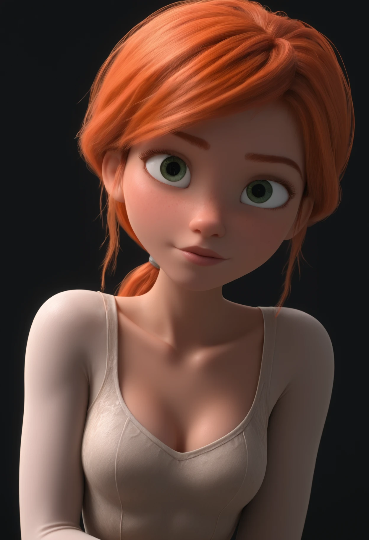 F3licie, green eyes, orange hair, low ponytail