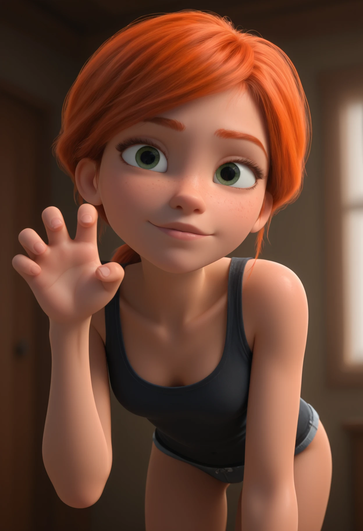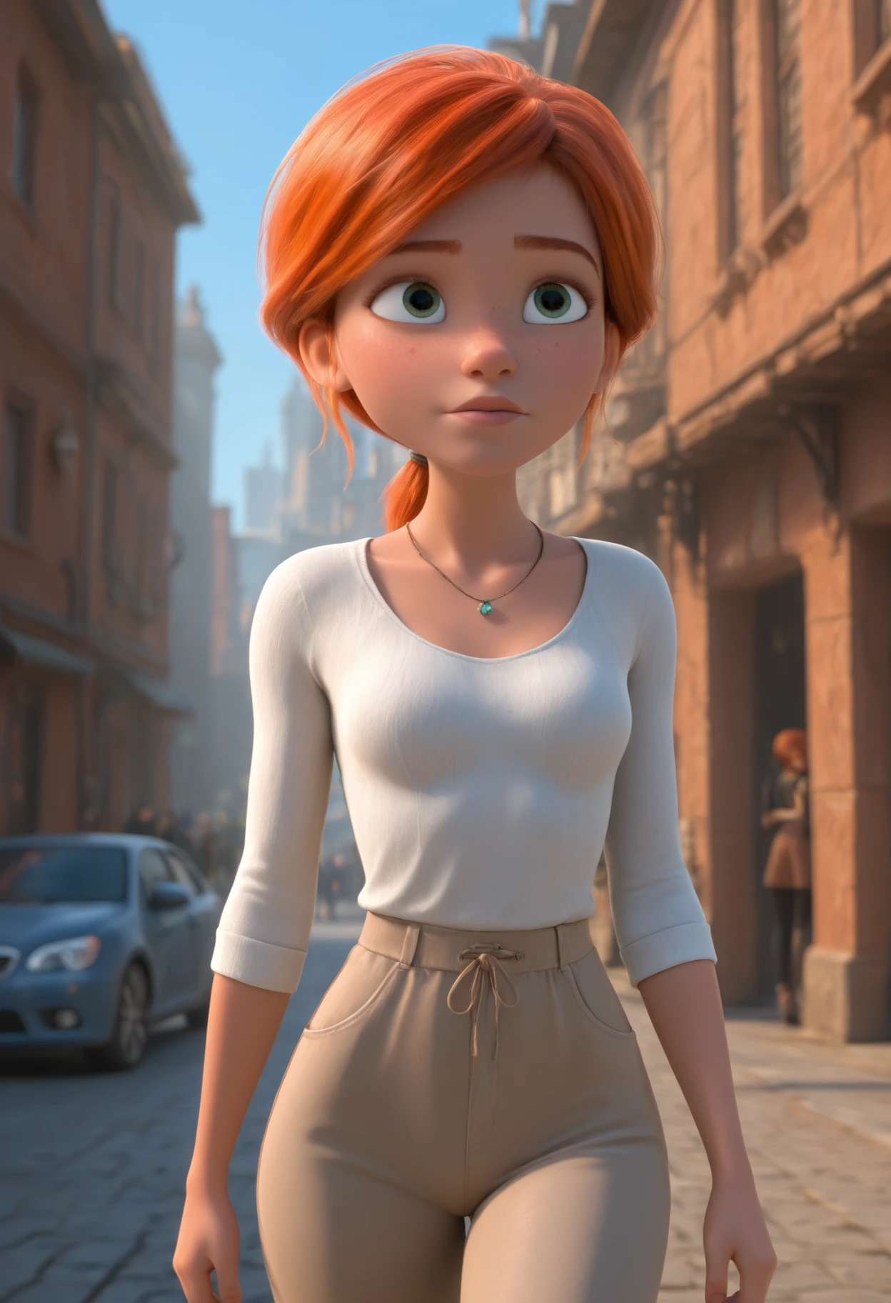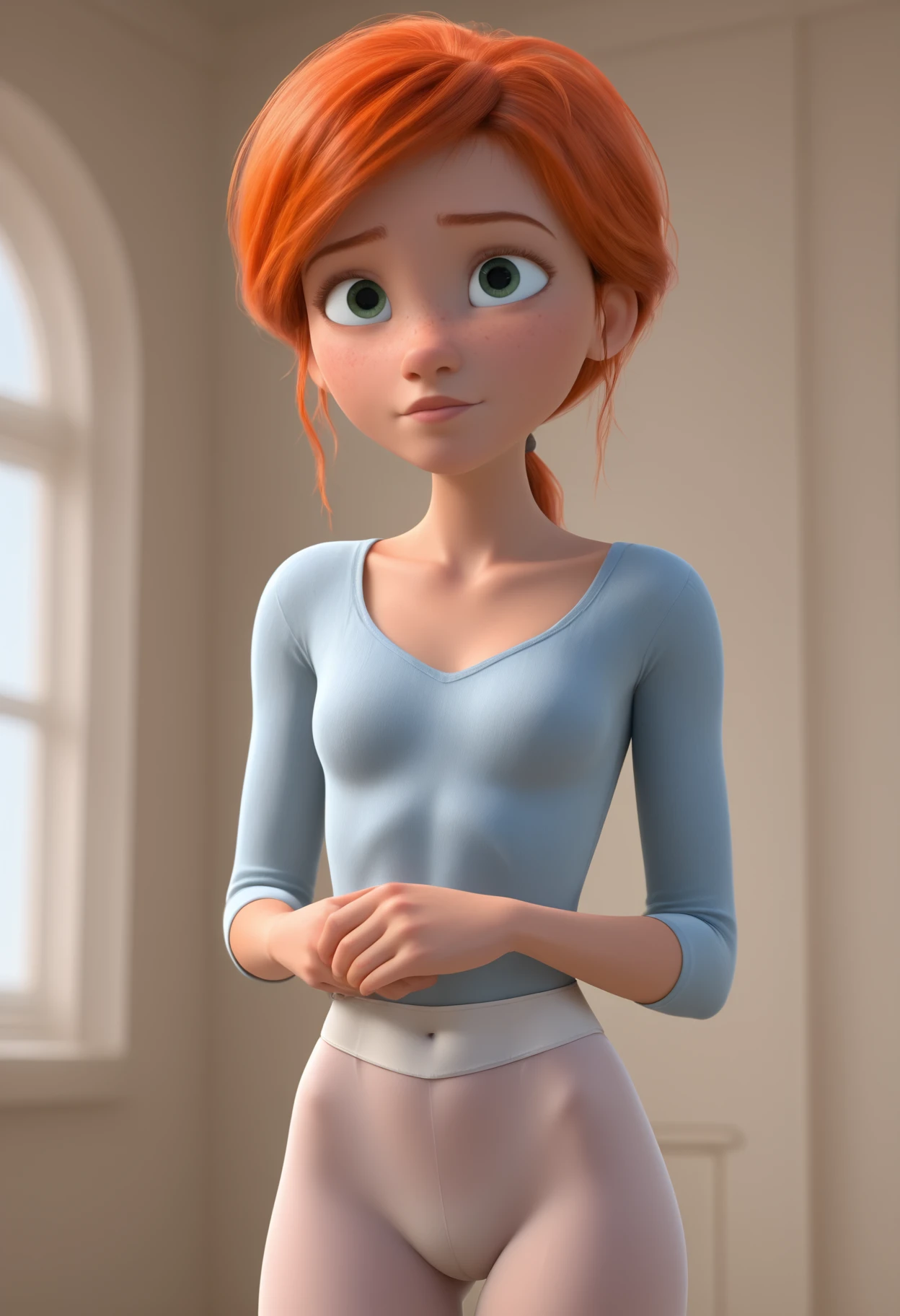 F3licie, green eyes, orange hair, low ponytail