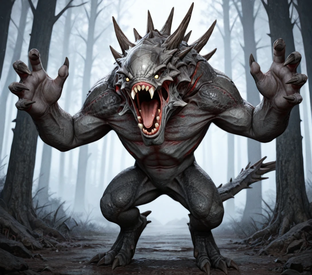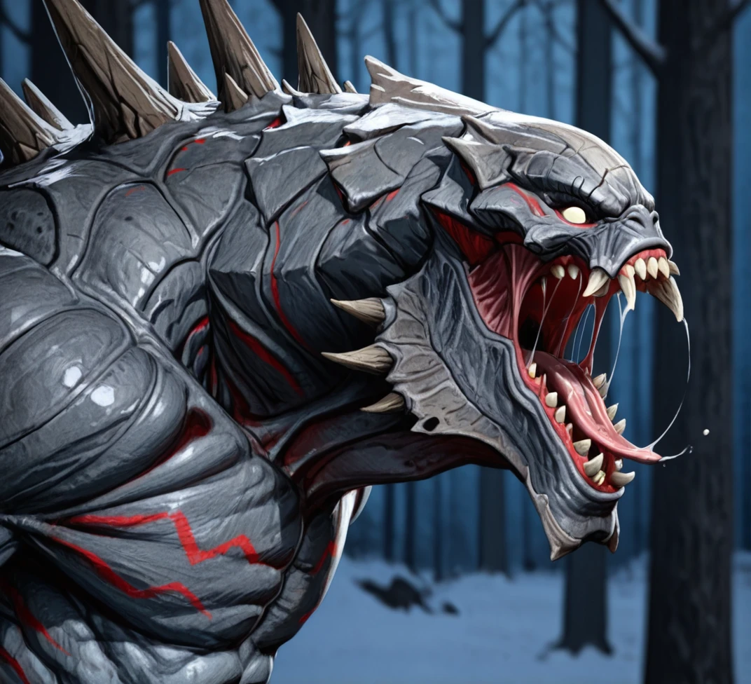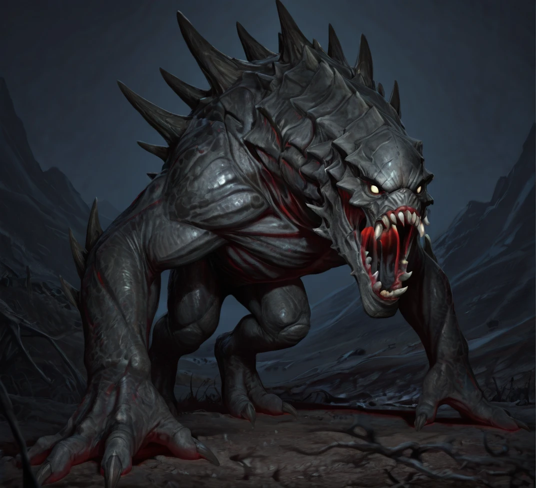 Tags: g0liath, monster, creature, tail, claws, spikes, sharp teeth, open mouth, red accents, digitigrade, back spikes, no pupils,