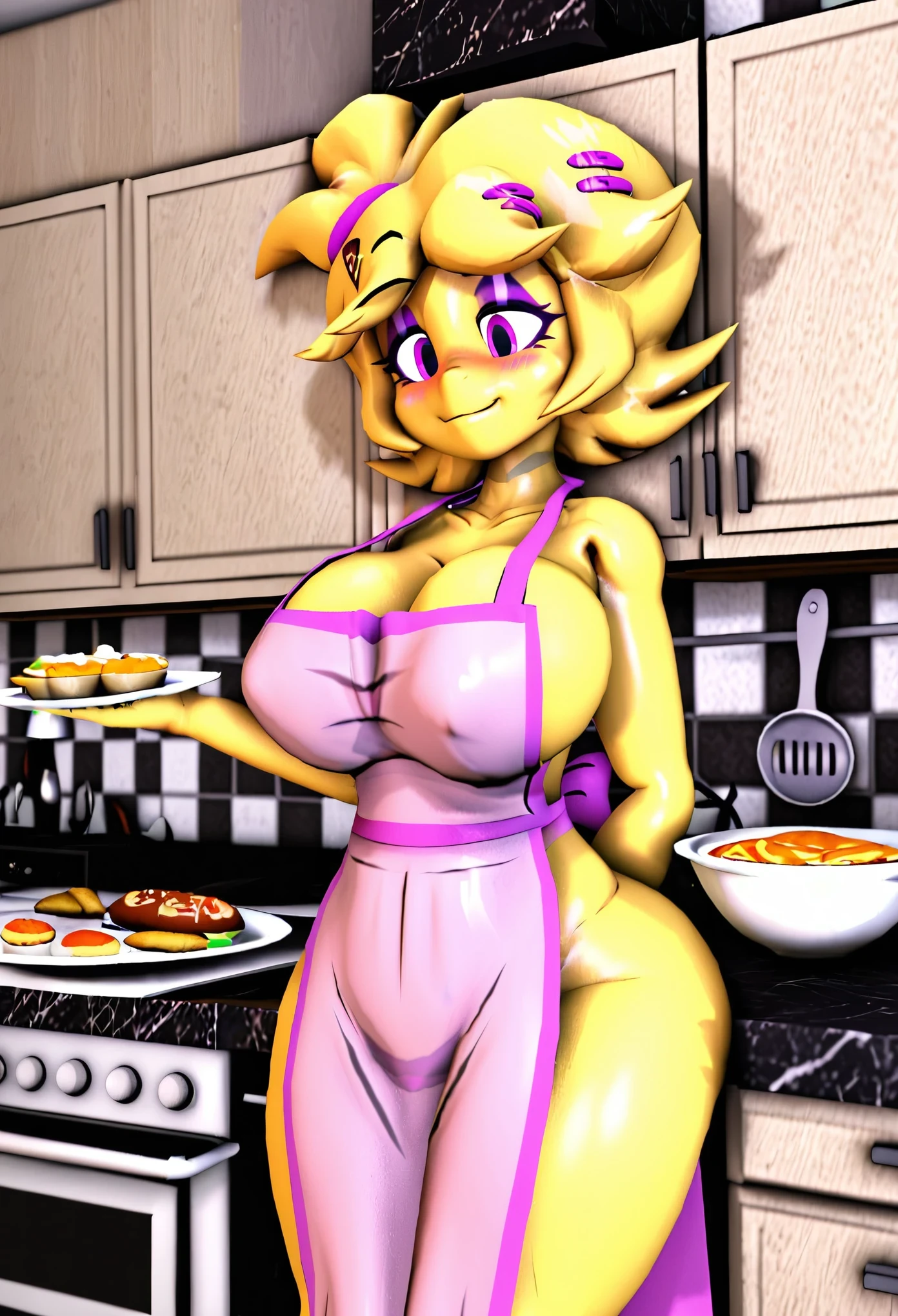 chiku, yellow body, hair clips, pink eyes, purple eyeliner, hair tie,
