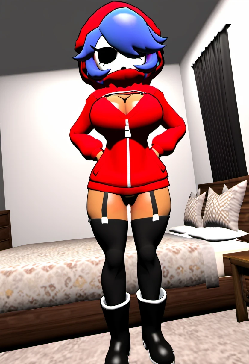 Most funky (ps you can change the color of the hoodie): shygal, black sclera, no pupils, black eyes, mask, white face, red hoodie, garter belt, boots, blue hair,