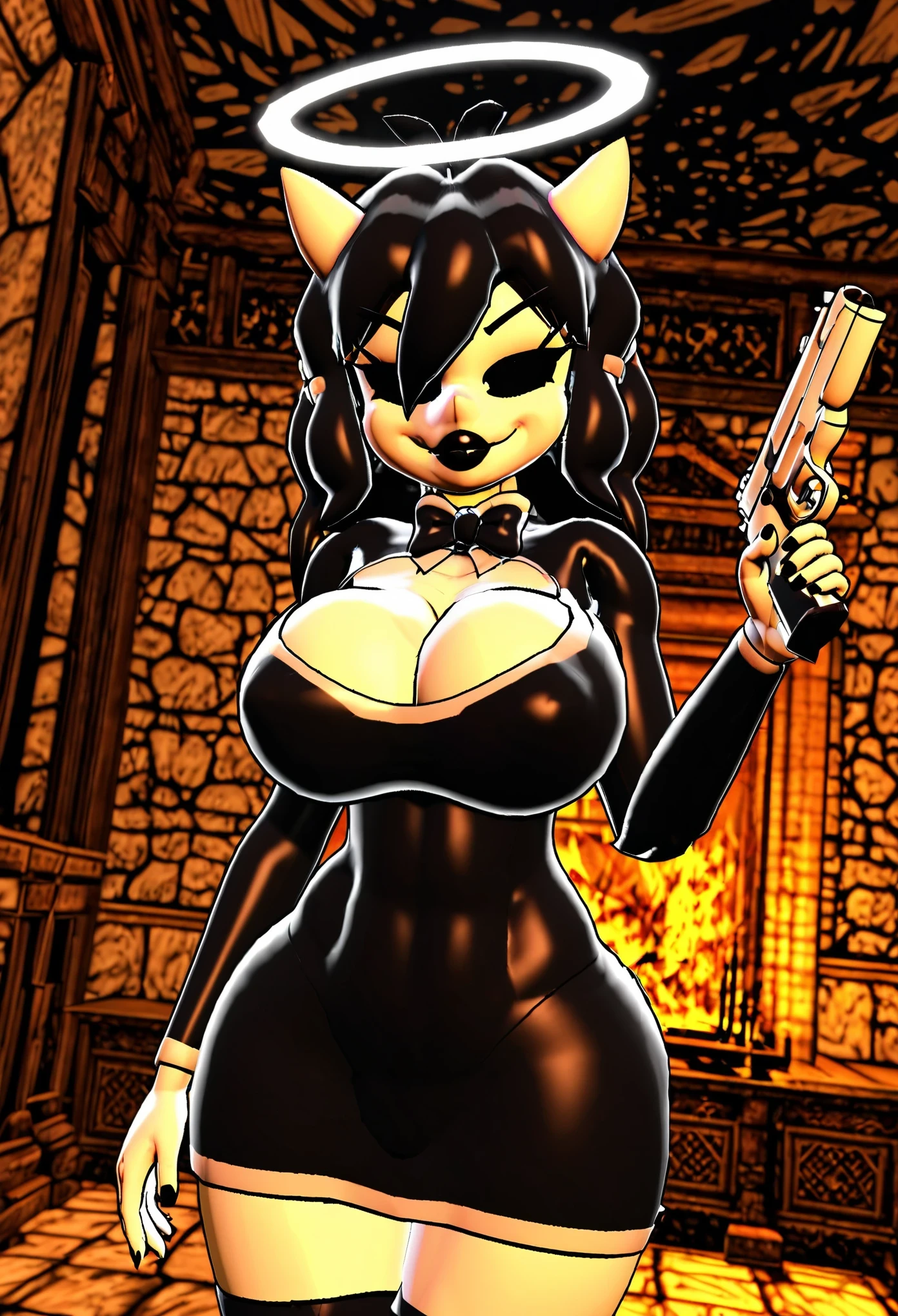 Alice angel, black hair, white body, black sclera, no pupils, black eyes, horns, black lipstick, halo,