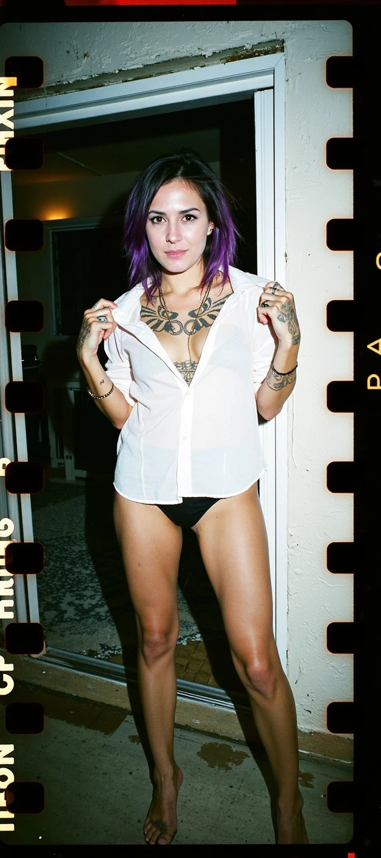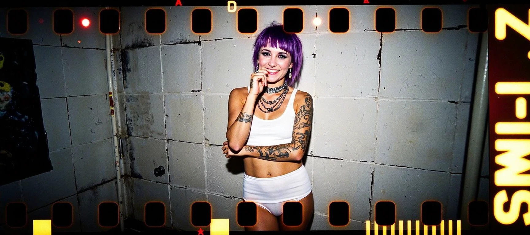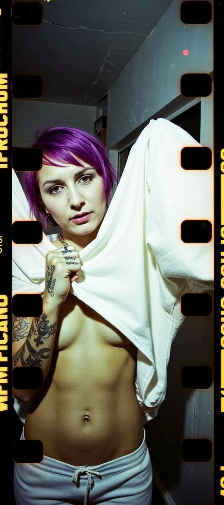 Creates experimental sprocket hole photography. Trained with pictures of females in provocative fashion. Light Leaks & Overexposure & High Contrast pictures only. 1728 x 768 works nicely for me.