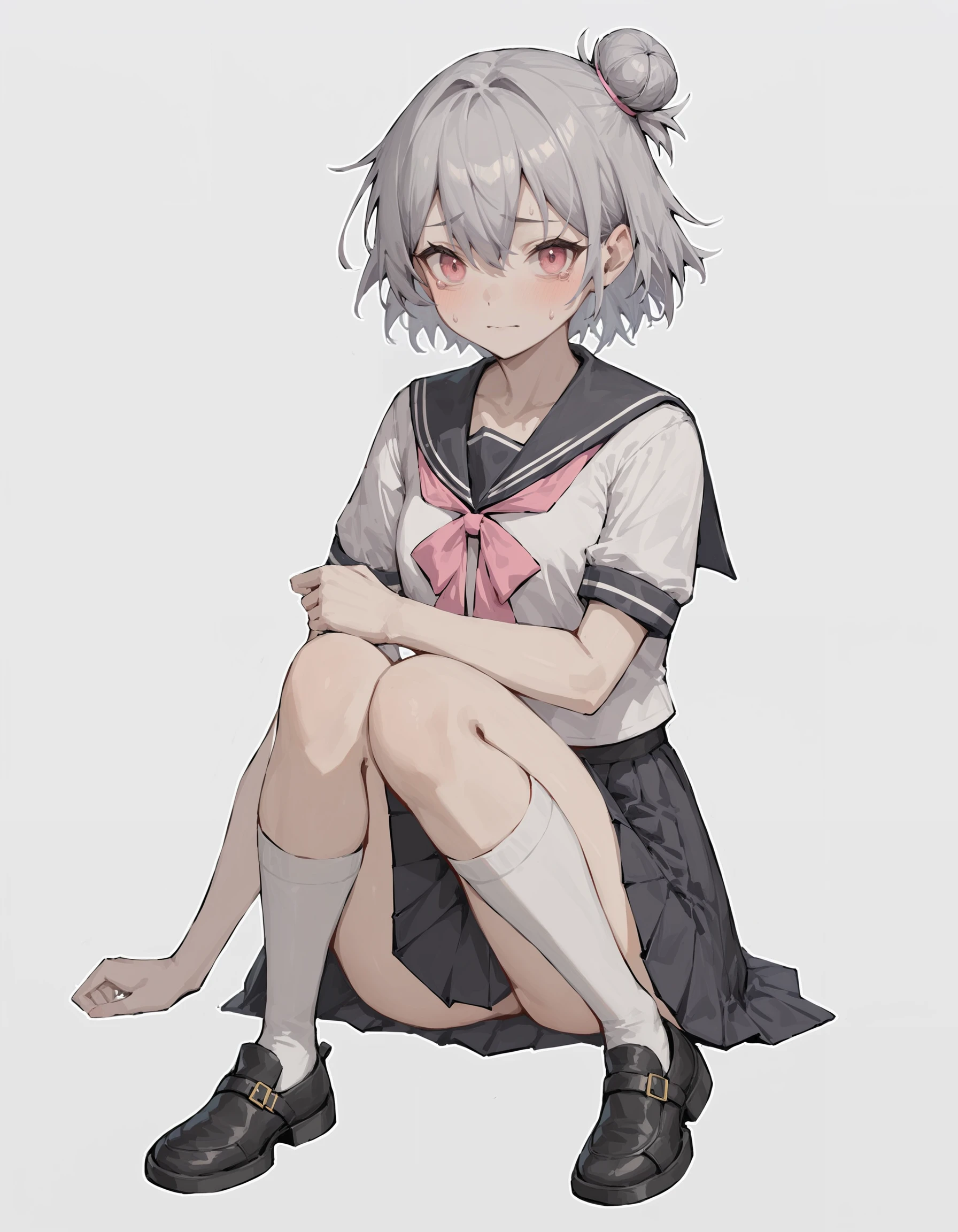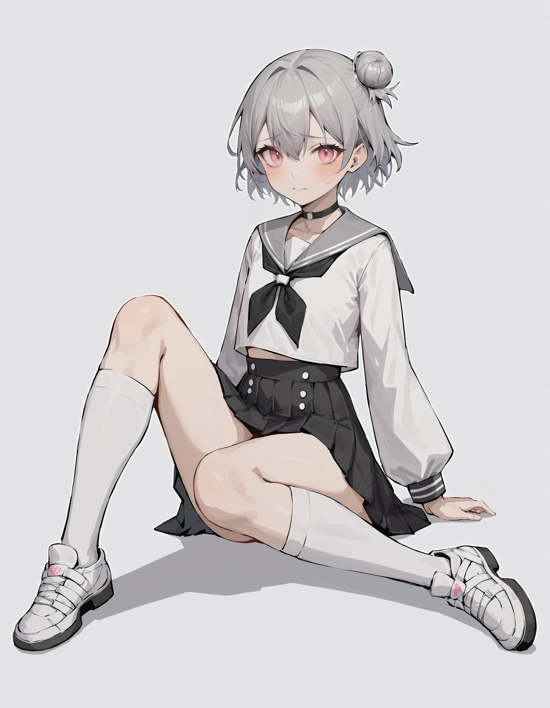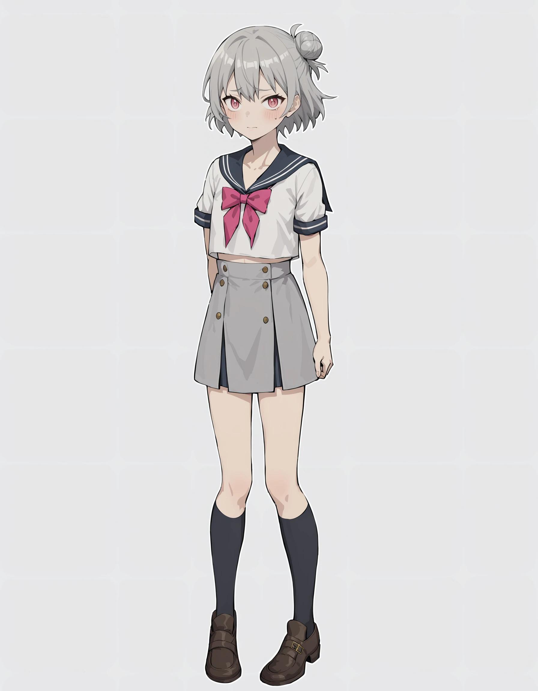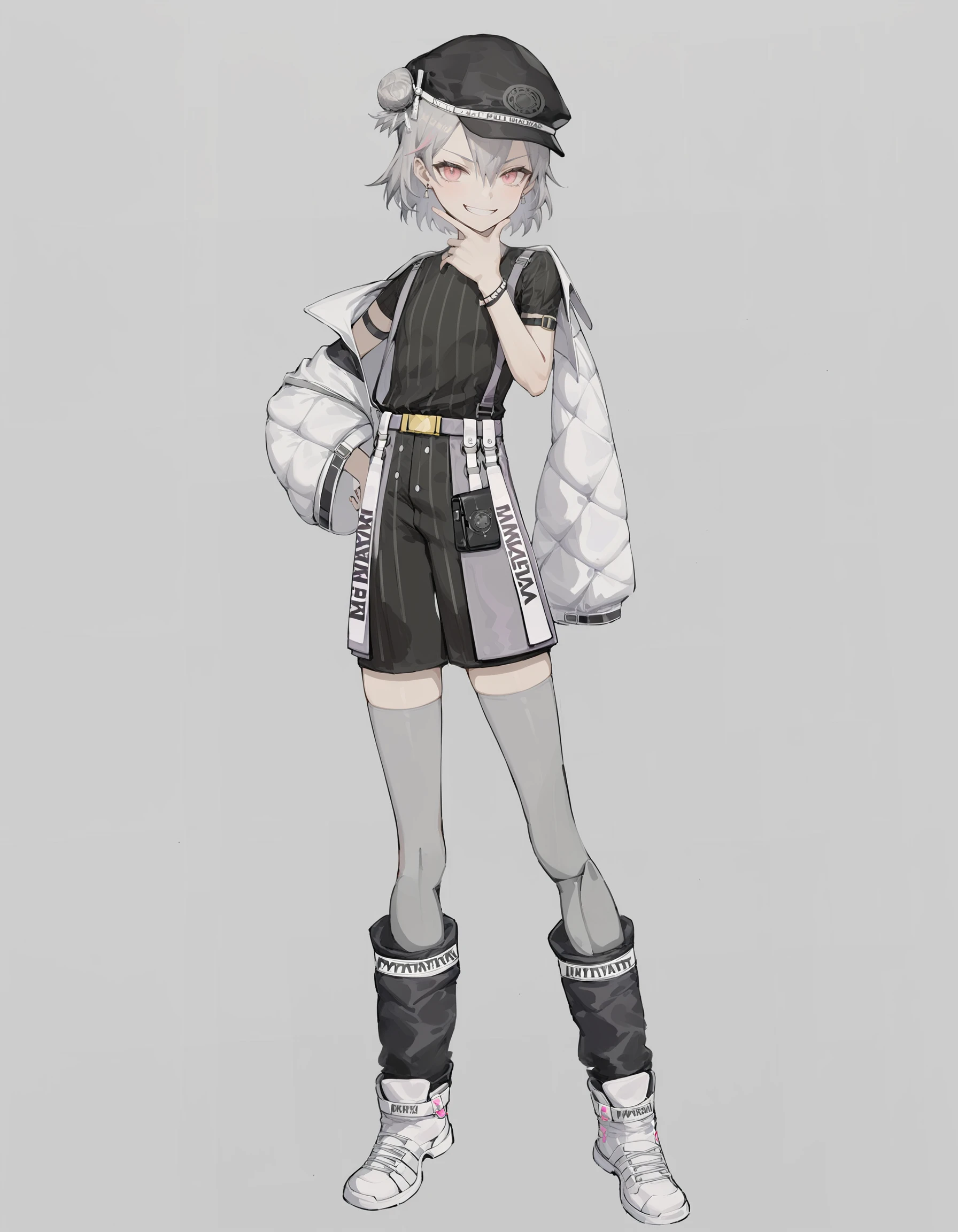 duominixi,1girl,solo,shirt,hat,grey hair,black headwear,shorts,hair bun,short hair,pink eyes,jacket,black shorts,black shirt,jewelry,grey thighhighs,Description