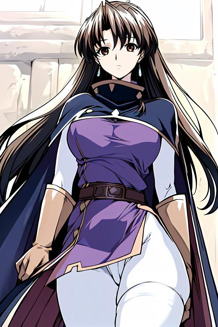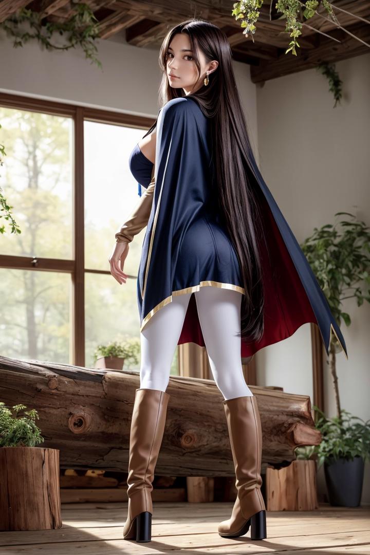(black cape:1.2), (brown_knee_boots:1.2), (blue dress:1.2), belt, brown elbow gloves, jewelry, (white pantyhose:1.2)