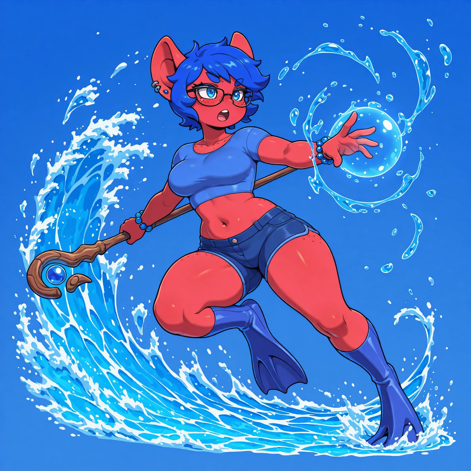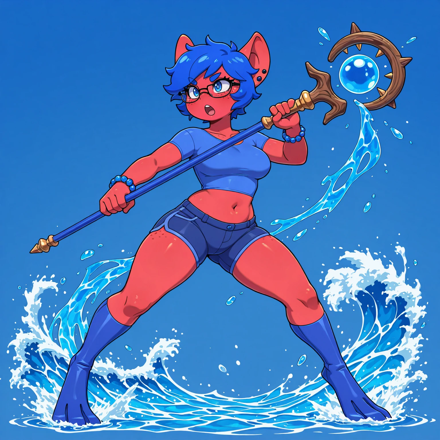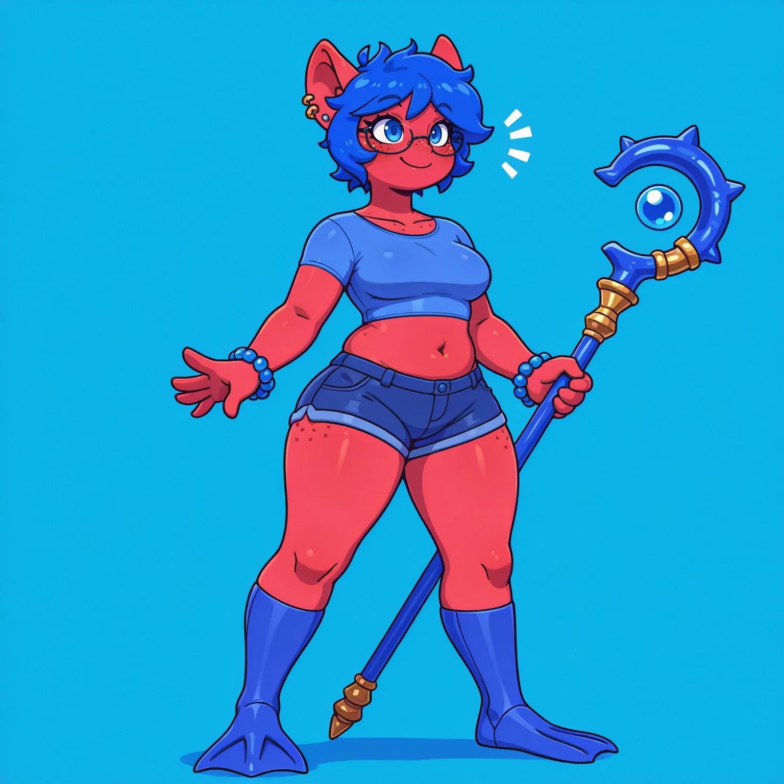 ClaireAxugaem, amphibion girl, blue short hair, red skin, blue eyes, glasses, pointed ears, freckles on cheeks, ear piercing, bead bracelet,