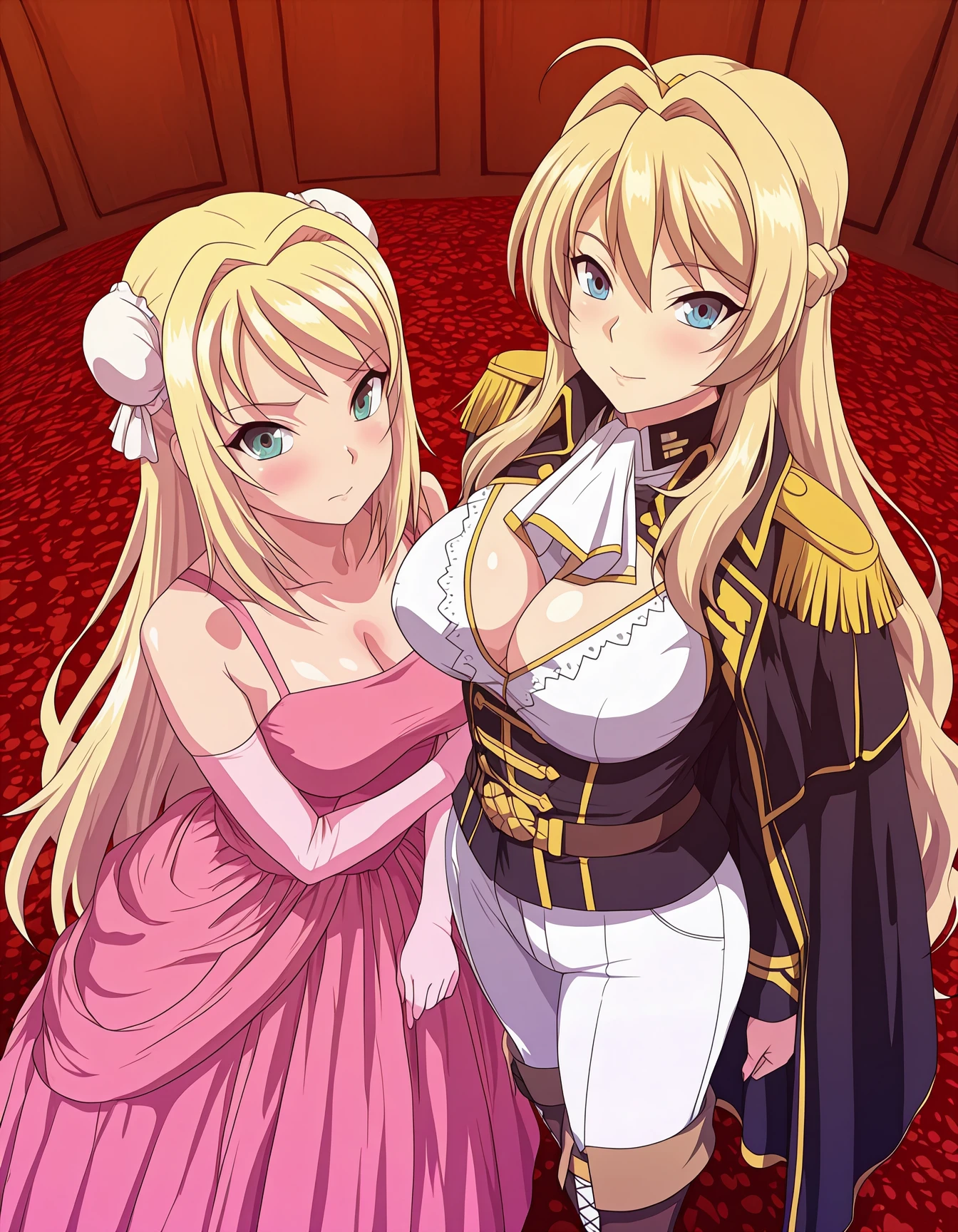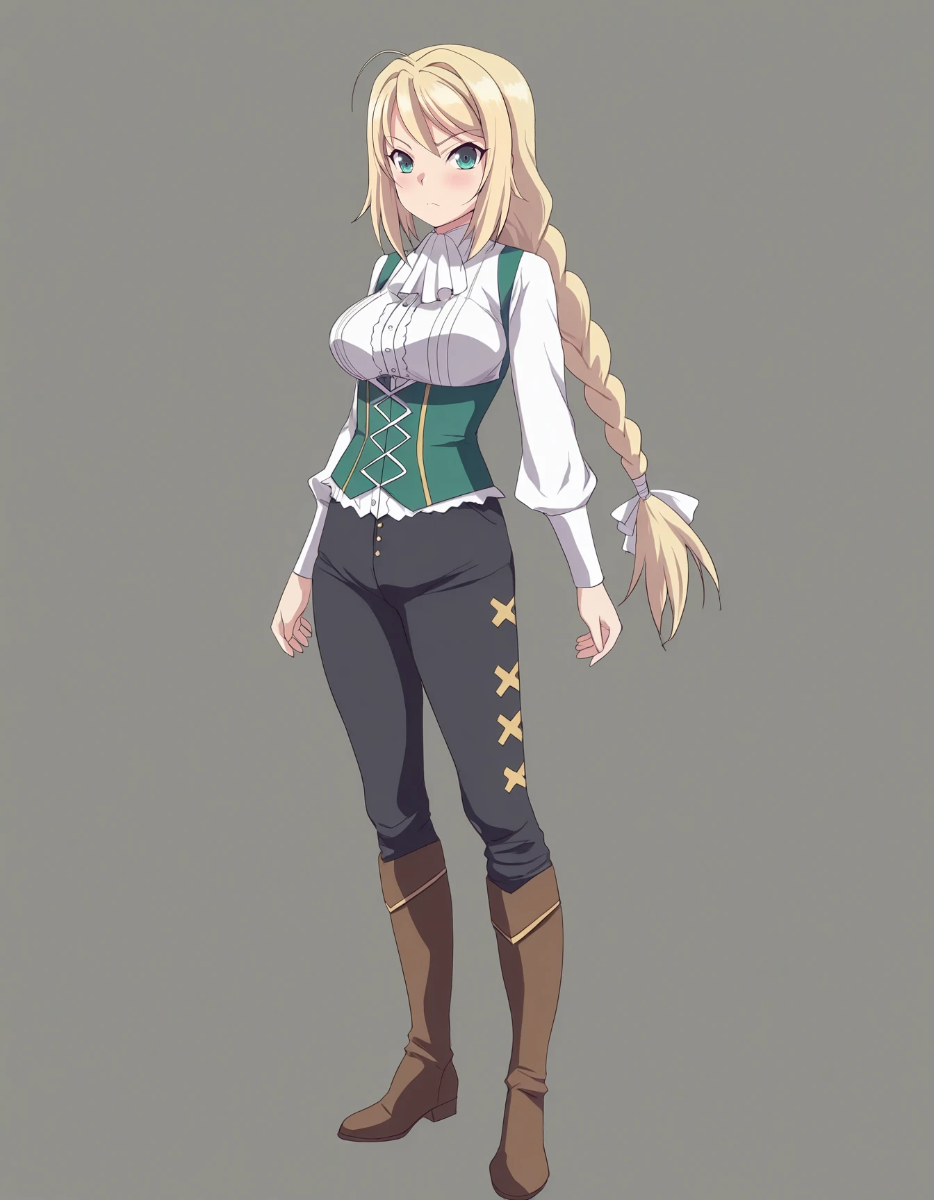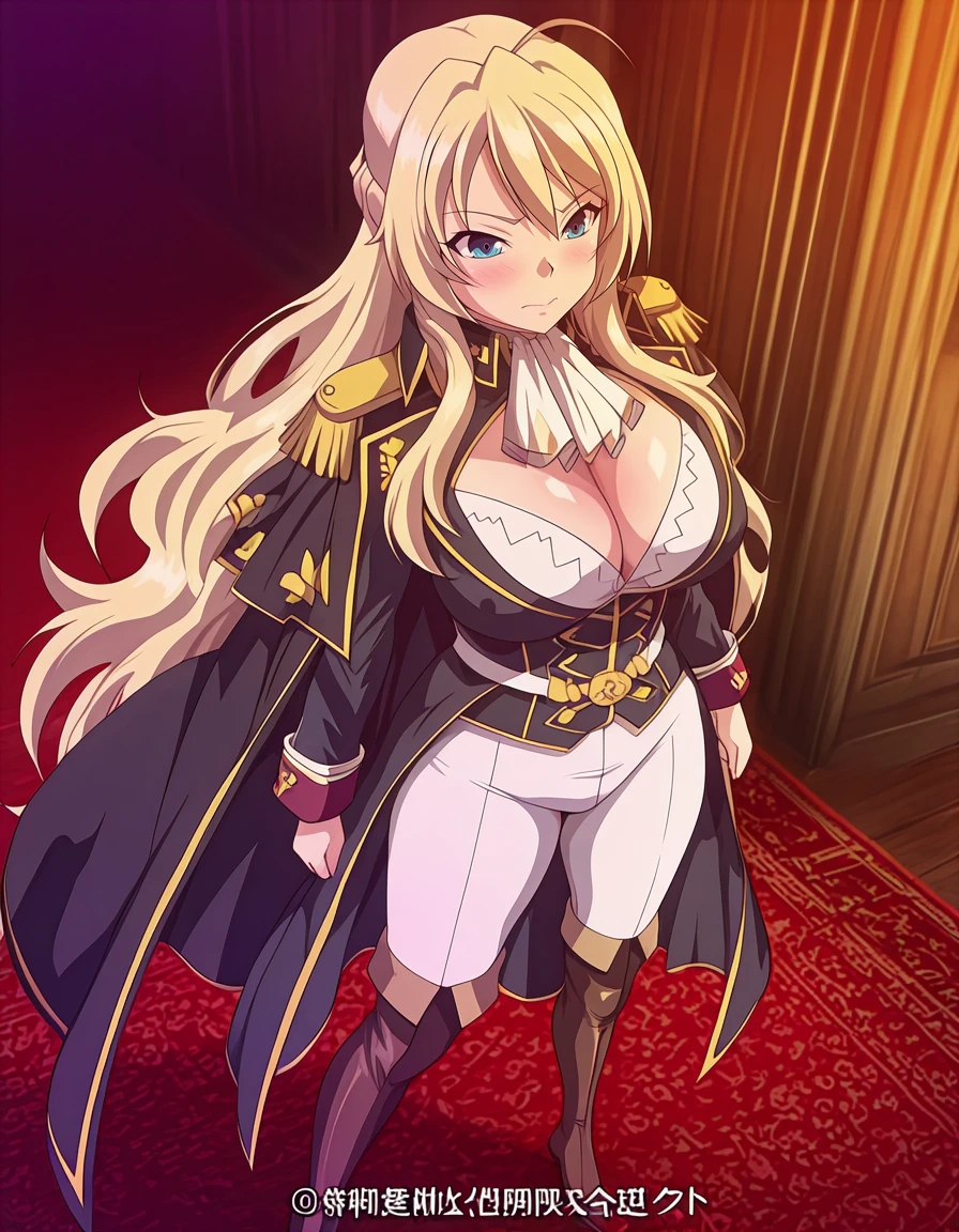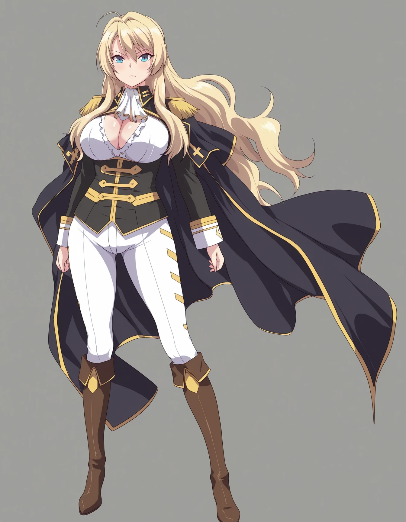 mai_mnn,mai_mireillemn,mature_female,aged_up,blonde_hair,long_hair,french_braid,blue_eyes,large_breasts,long_legs,military_uniform,black_jacket,cleavage,white_pants,thigh-high_boots,brown footwear,epaulettes,black_capeIris VON AUSTRIA アイリス・フォン・アウストリア